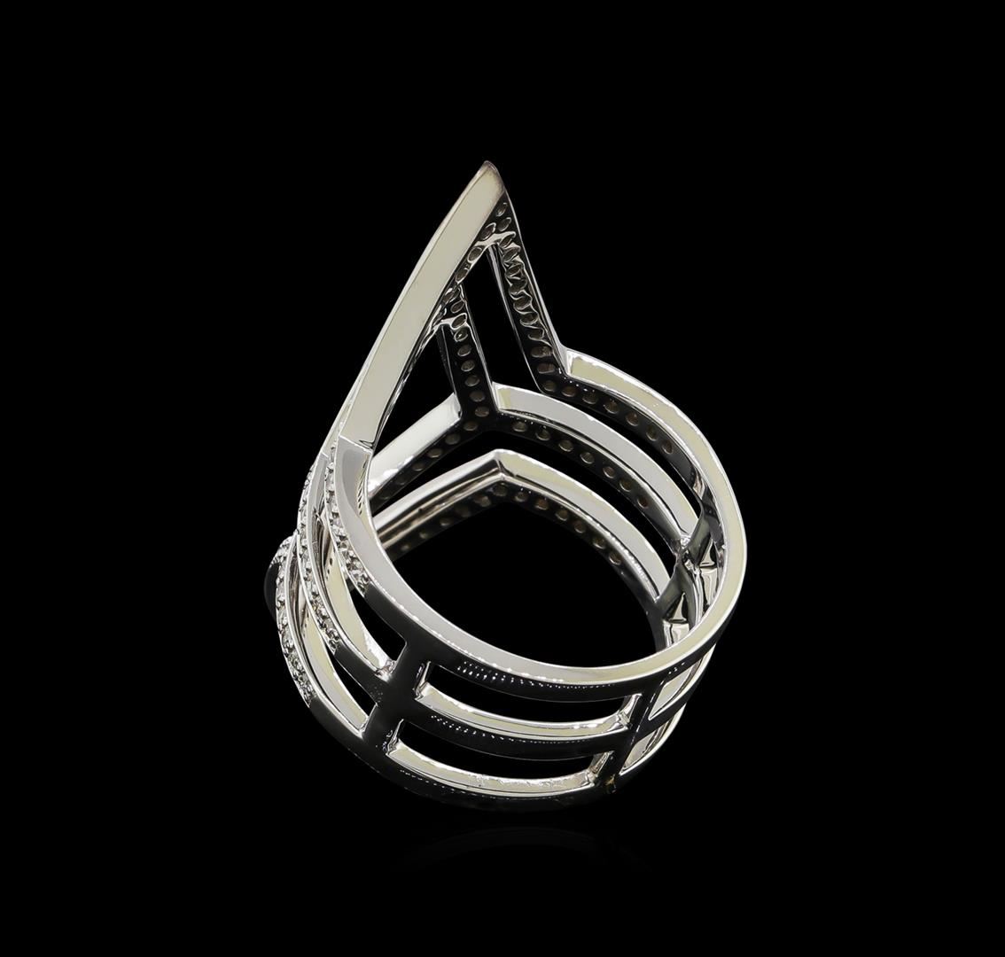 One electronically tested 14KT white gold lady's cast fashion ring with a triple shank with a bright polish finish. The featured lady's ring has a center diamond shape motif shadow by an outer diamond shape measuring 36 millimeters in length, and a triple shank measuring 10.65 millimeters wide. Identified with markings of '585'. Condition is new, good workmanship. Containing: One Hundred Eighteen prong set round brilliant cut diamonds, measuring 1.20 - 1.15 x 0.73mm (depth est.) approximate total weight of 118 Stones = 0.72ct. Graded in the setting. Clarity SI-1 to I-1. Color: G - I Cut Good. Total Weight of Diamonds 0.72ct.. Total Weight of Ring 7.30gm GAS Appraised at $3,885.00.
