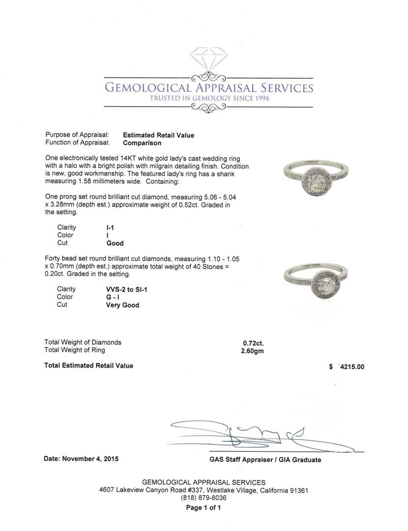 One electronically tested 14KT white gold lady's cast wedding ring with a halo with a bright polish with milgrain detailing finish. The featured lady's ring has a shank measuring 1.58 millimeters wide. Condition is new, good workmanship. Containing: One prong set round brilliant cut diamond, measuring 5.06 - 5.04 x 3.28mm (depth est.) approximate weight of 0.52ct. Graded in the setting. Clarity: I-1. Color: I. Cut Good Forty bead set round brilliant cut diamonds, measuring 1.10 - 1.05 x 0.70mm (depth est.) approximate total weight of 40 Stones = 0.20ct. Graded in the setting. Clarity: VVS-2 to SI-1. Color: G - I. Cut Very Good. Total Weight of Diamonds 0.72ct. Total Weight of Ring 2.60gm GAS Appraised at $4,215.00.