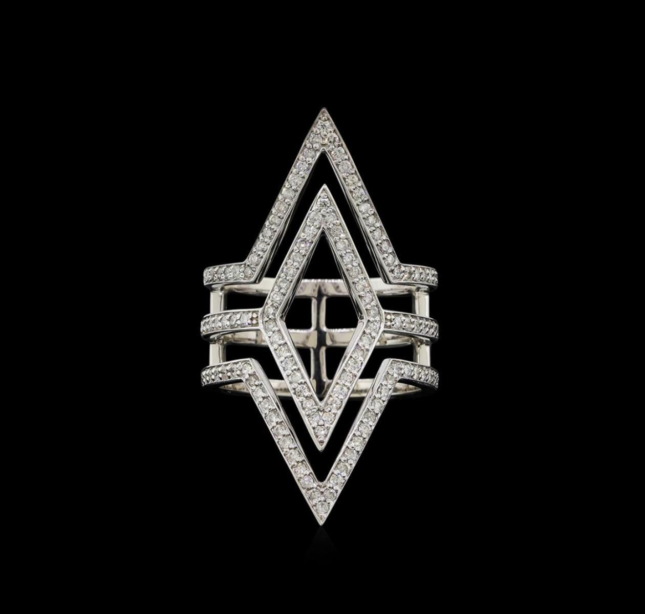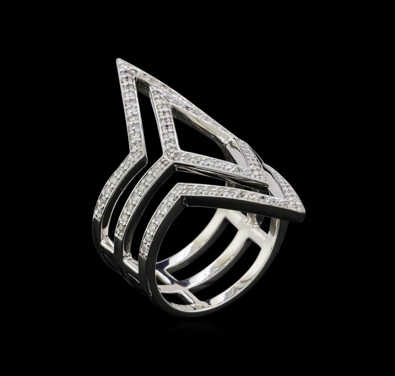 One electronically tested 14KT white gold lady's cast fashion ring with a triple shank with a bright polish finish. The featured lady's ring has a center diamond shape motif shadow by an outer diamond shape measuring 36 millimeters in length, and a triple shank measuring 10.65 millimeters wide. Identified with markings of '585'. Condition is new, good workmanship. Containing: One Hundred Eighteen prong set round brilliant cut diamonds, measuring 1.20 - 1.15 x 0.73mm (depth est.) approximate total weight of 118 Stones = 0.72ct. Graded in the setting. Clarity SI-1 to I-1. Color: G - I Cut Good. Total Weight of Diamonds 0.72ct.. Total Weight of Ring 7.30gm GAS Appraised.
