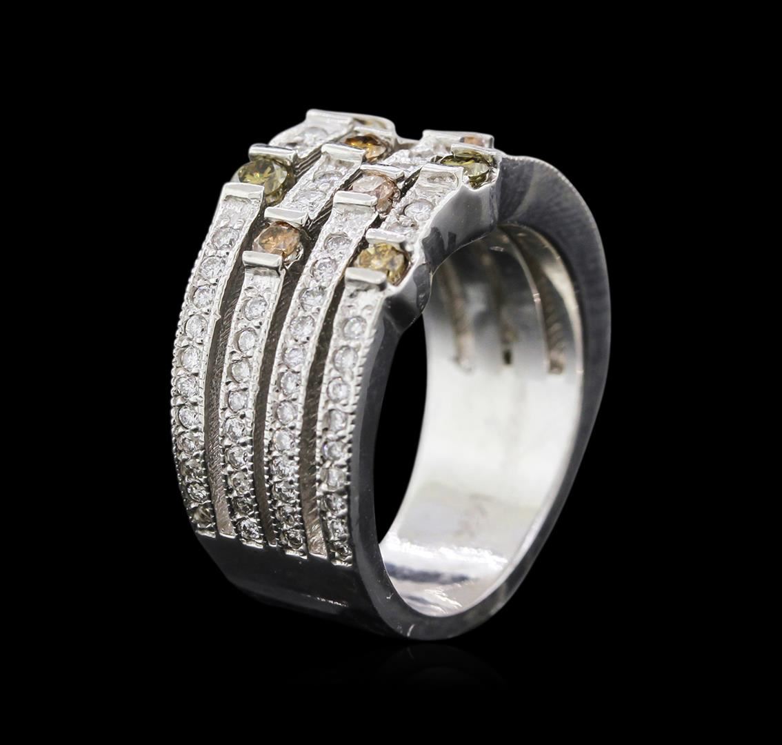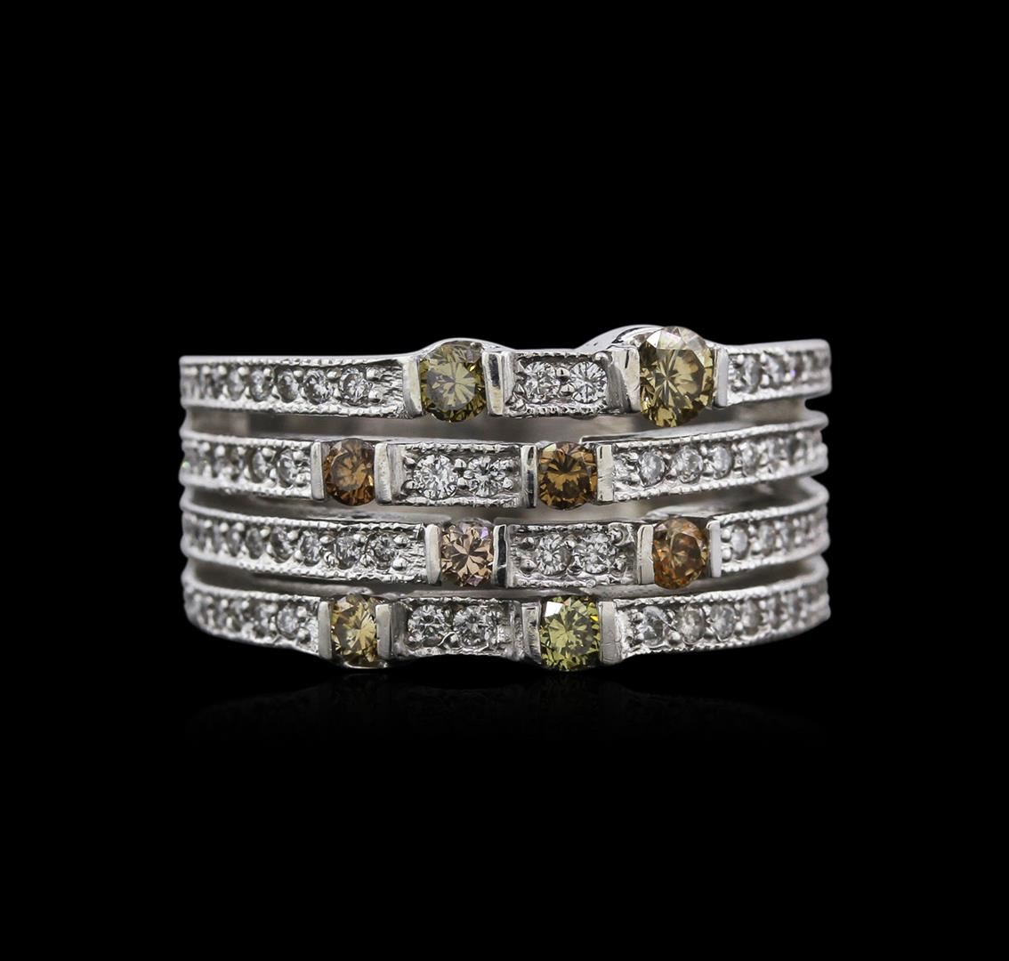 One electronically tested 14KT white gold ladies cast diamond ring with a bright polish finish. Identified with markings of "14K". Condition is very good. Containing: Ninety-Six prong set round brilliant cut diamonds, measuring 1.00 - 1.00 x 0.60mm (depth est.) approximate total weight of 96 Stones = 0.35ct. Clarity: SI-2. Color: H - I, Cut is Good. Four prong set round brilliant cut diamonds, measuring 3.00 - 2.20 x 1.56mm (depth est.) approximate total weight of 4 Stones = 0.26ct. Clarity: SI-1, color of fancy yellowish green, cut is good. Four prong set round brilliant cut diamonds, measuring 2.00 - 2.00 x 1.20mm (depth est.) approximate total weight of 4 Stones = 0.12ct. Clarity: SI-1, color of fancy brown, cut is good. Diamonds are graded in the mounting, unless otherwise stated. Total Weight of Diamonds 0.72ct. Total Weight of Ring 10.30 grams. GGL Appraised at $2,885.00.