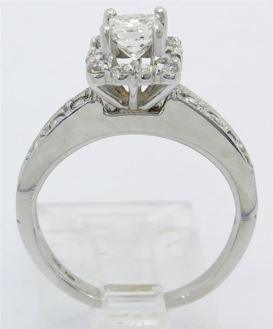 One tested 14K white gold diamond ring. Containing: One Princess Cut Diamond. Approximate size: .42CT, Clarity: I, Color: F-G. 22 Round Brilliant Cut Diamonds. Approximate total diamond weight: .72CTW. Diamonds are graded in the mounting, unless otherwise stated. Weight: 3.6 grams. Size: 5.00