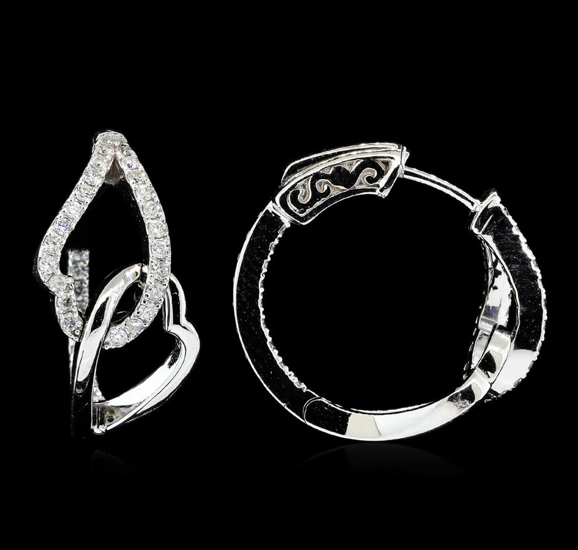 One pair electronically tested 14KT white gold lady's combination cast & assembled fashion earrings with hinged, snap locking posts with a bright polish finish. Identified with markings of 'K14'. Condition is new, good workmanship. Containing: Eight prong set round brilliant cut diamonds, measuring 1.90 - 1.50 x 1.02mm (depth est.) approximate total weight of 8 Stones = 0.14ct. Graded in the setting. Clarity VS-2 to SI-1. Color: H - I Cut Good Fifty-Eight prong set round brilliant cut diamonds, measuring 1.45 - 1.35 x 0.84mm (depth est.) approximate total weight of 58 Stones = 0.59ct. Graded in the setting. Clarity SI-1 to I-1. Color: H - I Cut Good. Total Weight of Diamonds 0.73ct.. Total Weight of Earrings 7.80gm GAS Appraised.