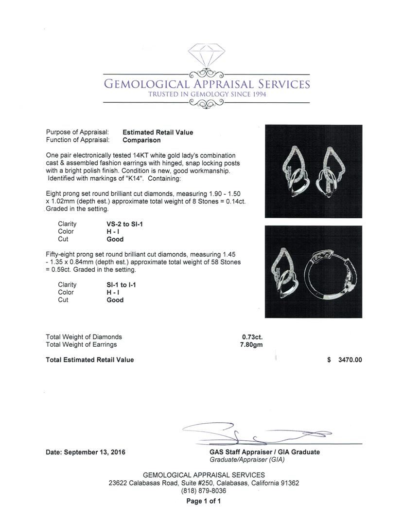 One pair electronically tested 14KT white gold lady's combination cast & assembled fashion earrings with hinged, snap locking posts with a bright polish finish. Identified with markings of 'K14'. Condition is new, good workmanship. Containing: Eight prong set round brilliant cut diamonds, measuring 1.90 - 1.50 x 1.02mm (depth est.) approximate total weight of 8 Stones = 0.14ct. Graded in the setting. Clarity VS-2 to SI-1. Color: H - I Cut Good Fifty-Eight prong set round brilliant cut diamonds, measuring 1.45 - 1.35 x 0.84mm (depth est.) approximate total weight of 58 Stones = 0.59ct. Graded in the setting. Clarity SI-1 to I-1. Color: H - I Cut Good. Total Weight of Diamonds 0.73ct.. Total Weight of Earrings 7.80gm GAS Appraised.