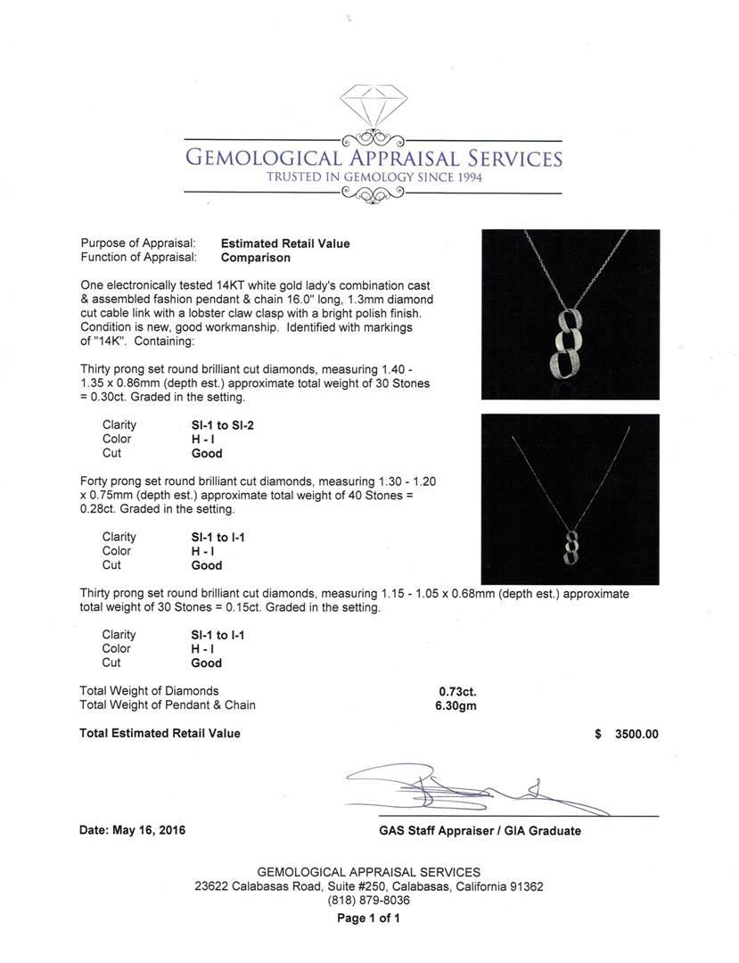 One electronically tested 14KT white gold lady's combination cast & assembled fashion pendant & chain 16.0" long, 1.3mm diamond cut cable link with a lobster claw clasp with a bright polish finish. Identified with markings of "14K". Condition is new, good workmanship. Containing: Thirty prong set round brilliant cut diamonds, measuring 1.40 - 1.35 x 0.86mm (depth est.) approximate total weight of 30 Stones = 0.30ct. Graded in the setting. Clarity: SI-1 to SI-2. Color: H - I. Cut Good Forty prong set round brilliant cut diamonds, measuring 1.30 - 1.20 x 0.75mm (depth est.) approximate total weight of 40 Stones = 0.28ct. Graded in the setting. Clarity: SI-1 to I-1. Color: H - I. Cut Good Thirty prong set round brilliant cut diamonds, measuring 1.15 - 1.05 x 0.68mm (depth est.) approximate total weight of 30 Stones = 0.15ct. Graded in the setting. Clarity: SI-1 to I-1. Color: H - I. Cut Good. Total Weight of Diamonds 0.73ct. Total Weight of Pendant & Chain 6.30gm. GAS Appraised at $3,500.00.