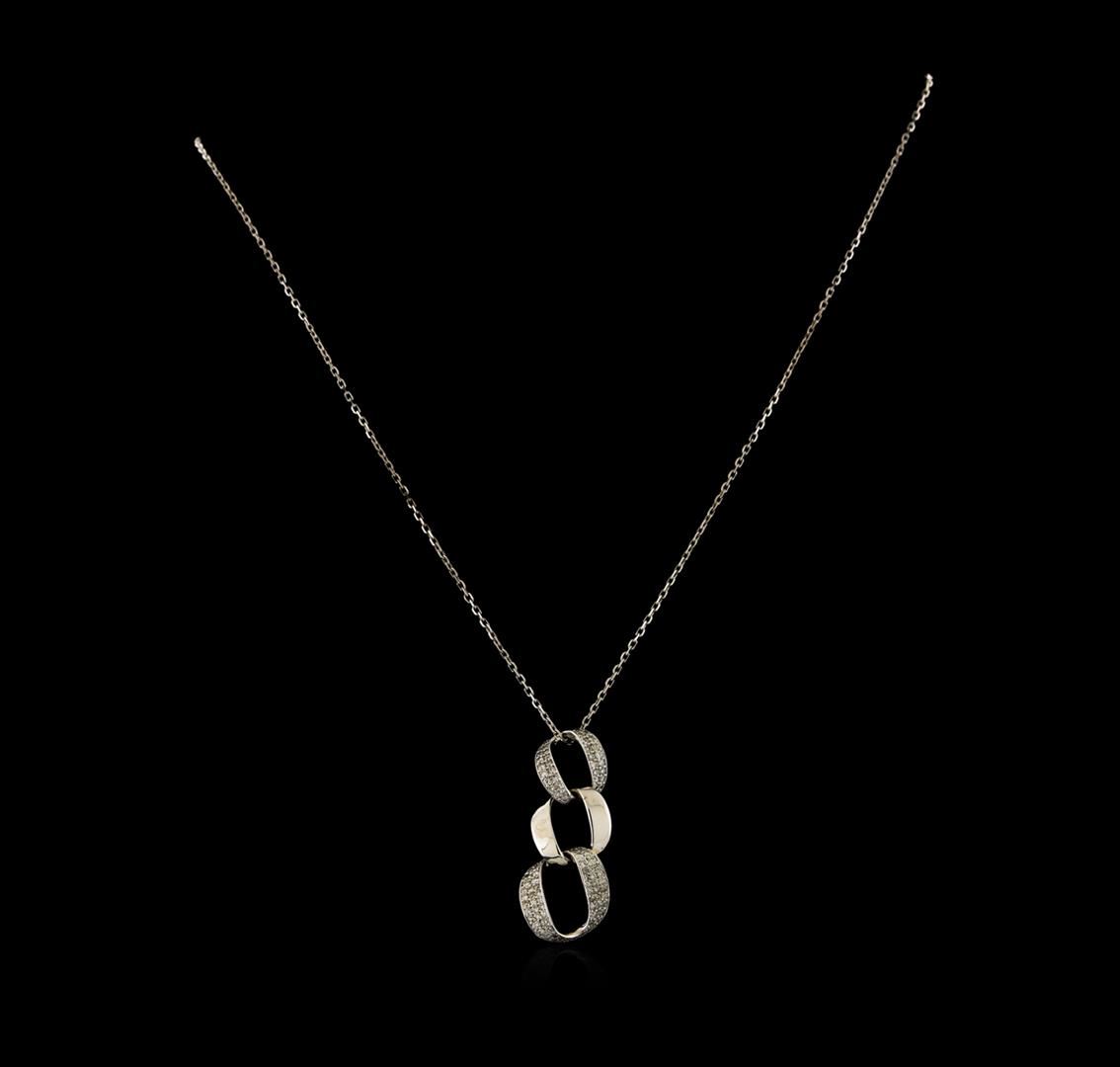 One electronically tested 14KT white gold lady's combination cast & assembled fashion pendant & chain 16.0" long, 1.3mm diamond cut cable link with a lobster claw clasp with a bright polish finish. Identified with markings of "14K". Condition is new, good workmanship. Containing: Thirty prong set round brilliant cut diamonds, measuring 1.40 - 1.35 x 0.86mm (depth est.) approximate total weight of 30 Stones = 0.30ct. Graded in the setting. Clarity: SI-1 to SI-2. Color: H - I. Cut Good Forty prong set round brilliant cut diamonds, measuring 1.30 - 1.20 x 0.75mm (depth est.) approximate total weight of 40 Stones = 0.28ct. Graded in the setting. Clarity: SI-1 to I-1. Color: H - I. Cut Good Thirty prong set round brilliant cut diamonds, measuring 1.15 - 1.05 x 0.68mm (depth est.) approximate total weight of 30 Stones = 0.15ct. Graded in the setting. Clarity: SI-1 to I-1. Color: H - I. Cut Good. Total Weight of Diamonds 0.73ct. Total Weight of Pendant & Chain 6.30gm. GAS Appraised at $3,500.00.