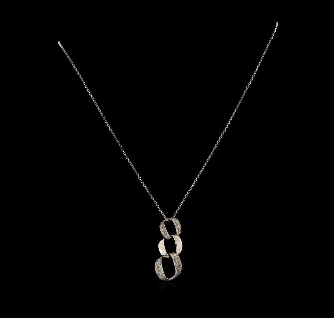 One electronically tested 14KT white gold lady's combination cast & assembled fashion pendant & chain 16.0" long, 1.3mm diamond cut cable link with a lobster claw clasp with a bright polish finish. Identified with markings of "14K". Condition is new, good workmanship. Containing: Thirty prong set round brilliant cut diamonds, measuring 1.40 - 1.35 x 0.86mm (depth est.) approximate total weight of 30 Stones = 0.30ct. Graded in the setting. Clarity: SI-1 to SI-2. Color: H - I. Cut Good Forty prong set round brilliant cut diamonds, measuring 1.30 - 1.20 x 0.75mm (depth est.) approximate total weight of 40 Stones = 0.28ct. Graded in the setting. Clarity: SI-1 to I-1. Color: H - I. Cut Good Thirty prong set round brilliant cut diamonds, measuring 1.15 - 1.05 x 0.68mm (depth est.) approximate total weight of 30 Stones = 0.15ct. Graded in the setting. Clarity: SI-1 to I-1. Color: H - I. Cut Good. Total Weight of Diamonds 0.73ct. Total Weight of Pendant & Chain 6.30gm. GAS Appraised at $3,500.00.