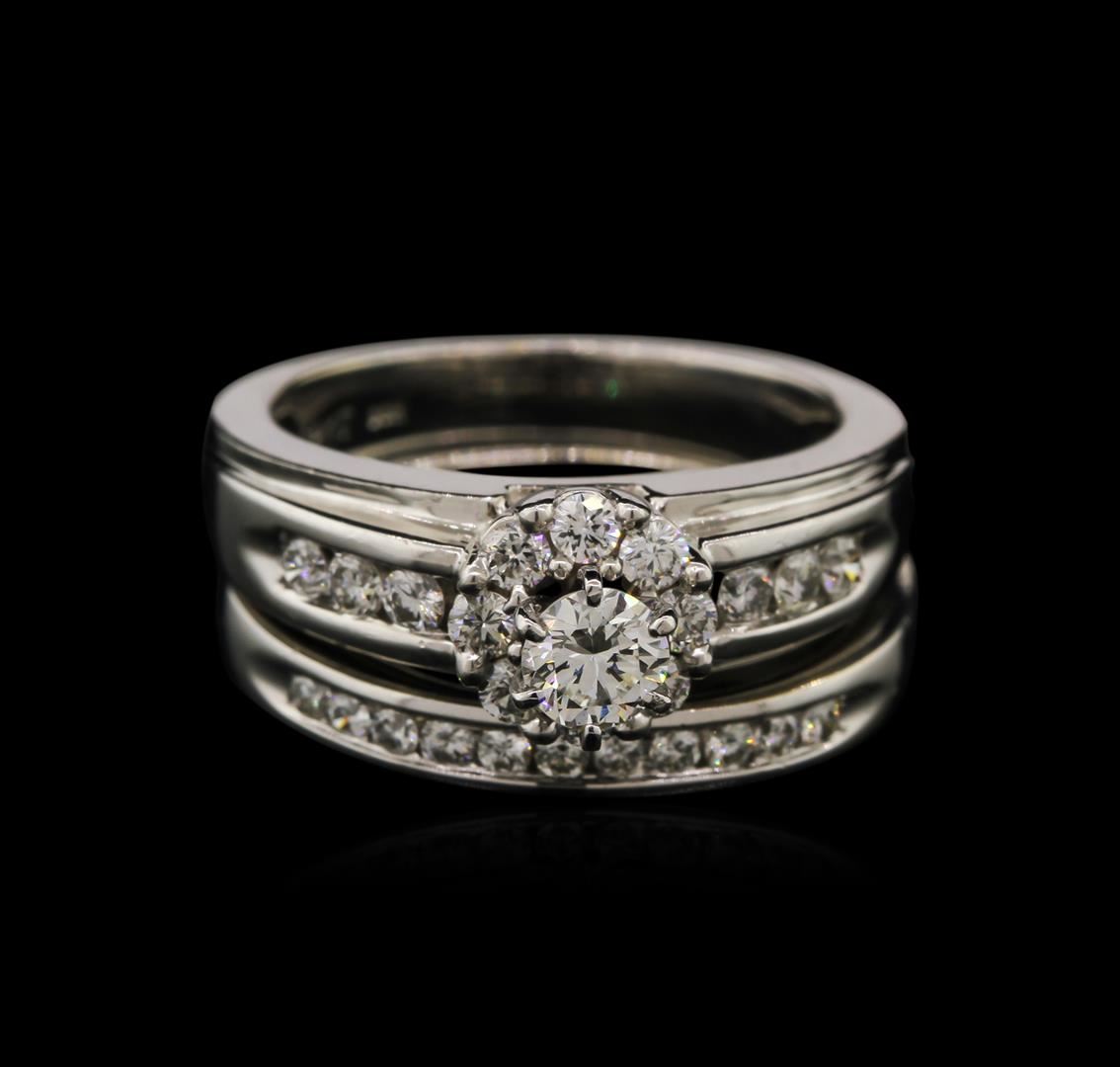 One electronically tested 14KT white gold ladies cast diamond engagement ring & wedding band with a bright polish finish. Identified with markings of "14K". Condition is new. Containing: One prong set round brilliant cut diamond, measuring 4.20 - 4.20 x 2.52mm (depth est.) approximate weight of 0.28ct. Clarity: VS-2. Color: J, Cut is Very Good. Twenty-Five channel set round brilliant cut diamonds, measuring 1.90 - 1.50 x 1.02mm (depth est.) approximate total weight of 25 Stones = 0.45ct. Clarity: VS-2 to SI-1. Color: I - J, Cut is Good. Diamonds are graded in the mounting, unless otherwise stated. Total Weight of Diamonds 0.73ct. Total Weight of Engagement Ring & Wedding Band 8.90 grams. GGL Appraised at $3,365.00.