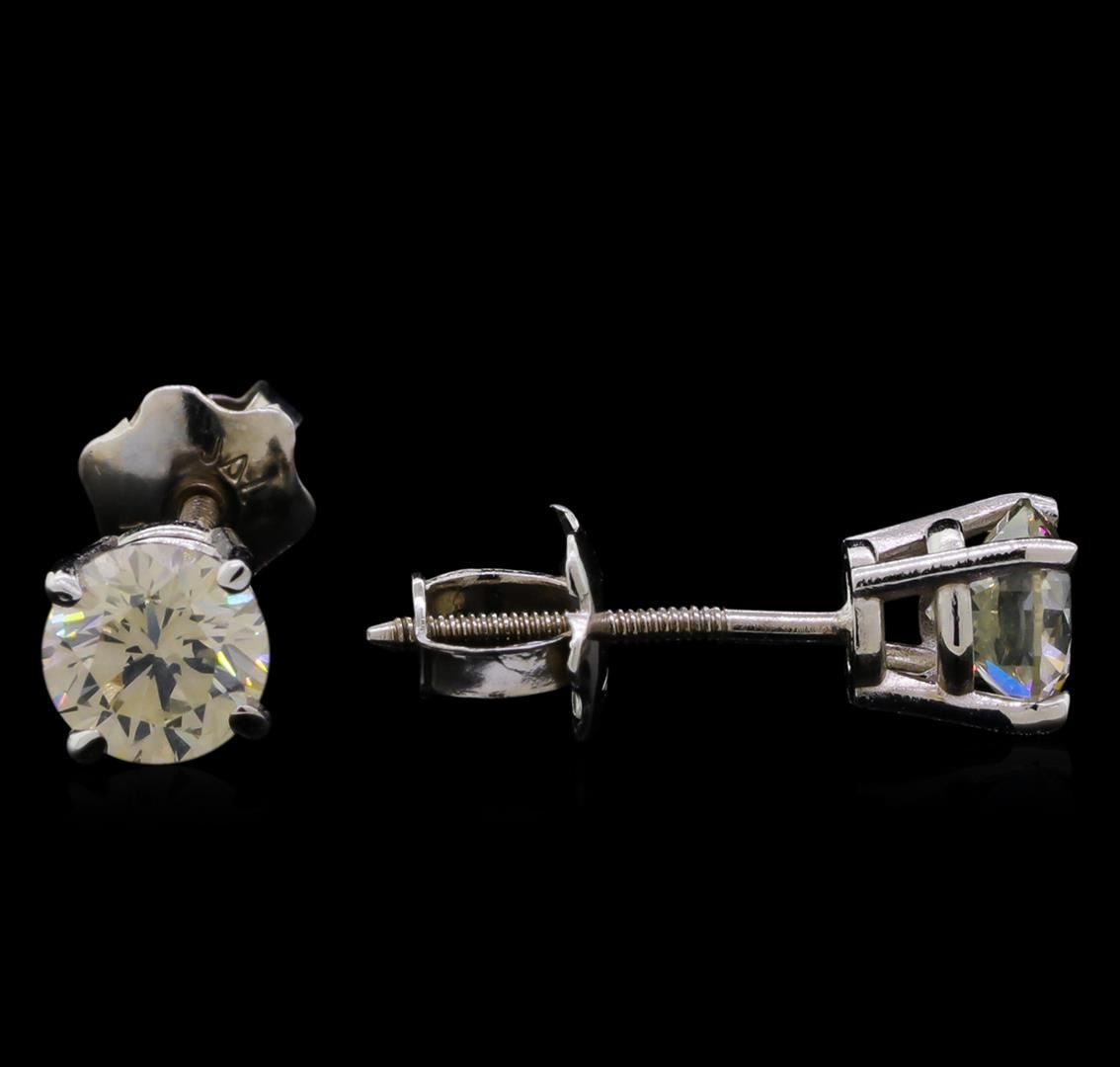 One pair electronically tested 14KT white gold cast & assembled diamond solitaire earrings with screw backs. Bright polish finish. Condition is new, good workmanship. Containing: One prong set round brilliant cut diamond, measuring 4.50 - 4.48 x 2.50mm (depth est.) approximate weight of 0.34ct with a faint yellow fluorescence. Graded in the setting. Clarity: I-1. Color: K. Depth 55.7%. Table 57.9%. One prong set round brilliant cut diamond, measuring 4.60 - 4.58 x 2.90mm (depth est.) approximate weight of 0.40ct with a faint yellow fluorescence. Graded in the setting. Clarity: I-1. Color: L. Depth 63.2%. Table 54.5%. Total Weight of Diamonds 0.74ct. Total Weight of Earrings 0.89gm. AIG Appraised at $1,685.00.
