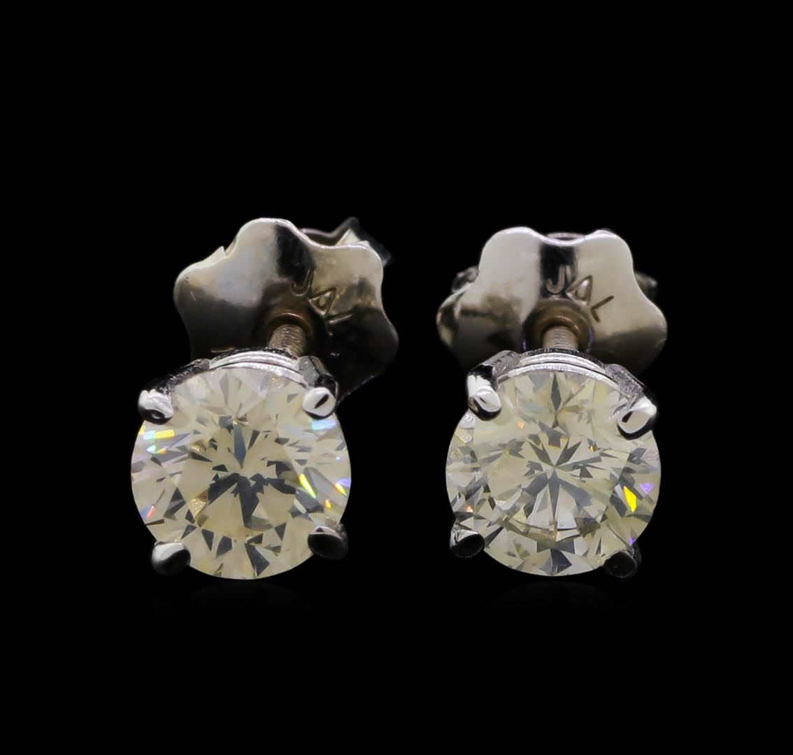 One pair electronically tested 14KT white gold cast & assembled diamond solitaire earrings with screw backs. Bright polish finish. Condition is new, good workmanship. Containing: One prong set round brilliant cut diamond, measuring 4.50 - 4.48 x 2.50mm (depth est.) approximate weight of 0.34ct with a faint yellow fluorescence. Graded in the setting. Clarity: I-1. Color: K. Depth 55.7%. Table 57.9%. One prong set round brilliant cut diamond, measuring 4.60 - 4.58 x 2.90mm (depth est.) approximate weight of 0.40ct with a faint yellow fluorescence. Graded in the setting. Clarity: I-1. Color: L. Depth 63.2%. Table 54.5%. Total Weight of Diamonds 0.74ct. Total Weight of Earrings 0.89gm. AIG Appraised at $1,685.00.
