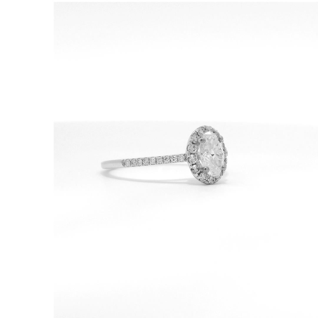 This 0.74 ctw diamond halo wedding ring in 14KT white gold is designed with a delicate yet captivating style, featuring a 0.50ct oval diamond with SI-2 clarity as the centerpiece. Surrounded by 31 round brilliant diamonds weighing 0.24ct, this ring radiates a graceful charm that will capture attention without overpowering. It's ideal for the bride seeking subtle elegance with a touch of sparkle.
