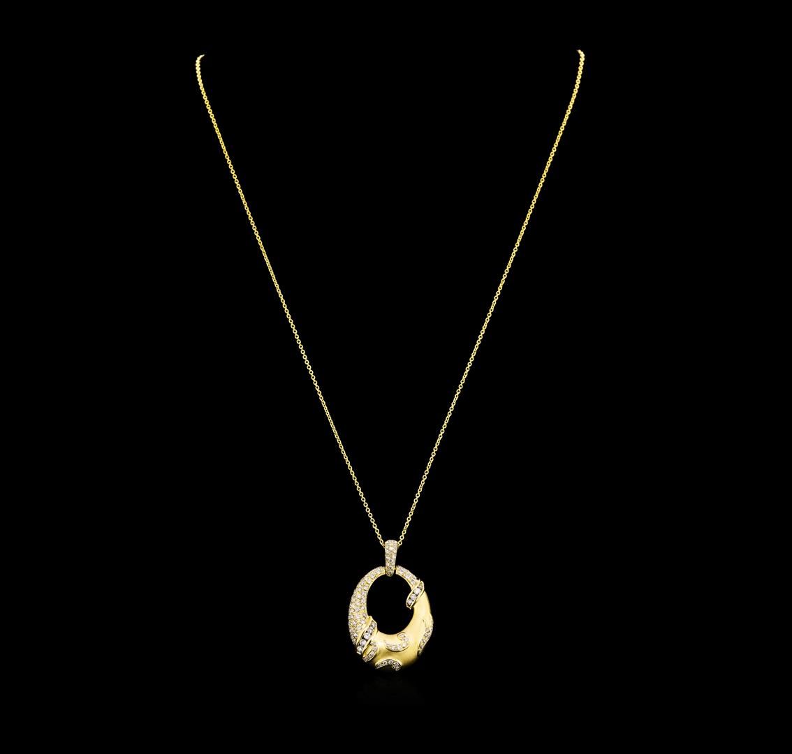 One electronically tested 14KT yellow gold lady's combination cast & assembled fashion pendant & chain 18.0' long, 1mm round cable link with a spring ring clasp with a bright polish finish. Trademark is Effy. Identified with markings of '14K'. Condition is new, good workmanship. Containing: Nine channel set round brilliant cut diamonds, measuring 1.80 - 1.50 x 1.02mm (depth est.) approximate total weight of 9 Stones = 0.17ct. Graded in the setting. Color H - I Clarity SI-1 to SI-2 Cut Good Eighty-Seven prong set round brilliant cut diamonds, measuring 1.30 - 1.10 x 0.74mm (depth est.) approximate total weight of 87 Stones = 0.57ct. Graded in the setting. Color H - I Clarity VS-2 to SI-2 Cut Good. Total Weight of Diamonds 0.74ct.. Total Weight of Pendant & Chain 7.60gm GAS Appraised at $3310.00. GAS Appraised at $3,310.00.