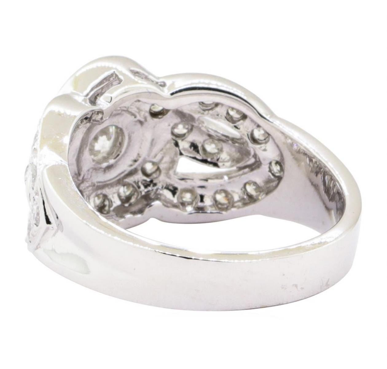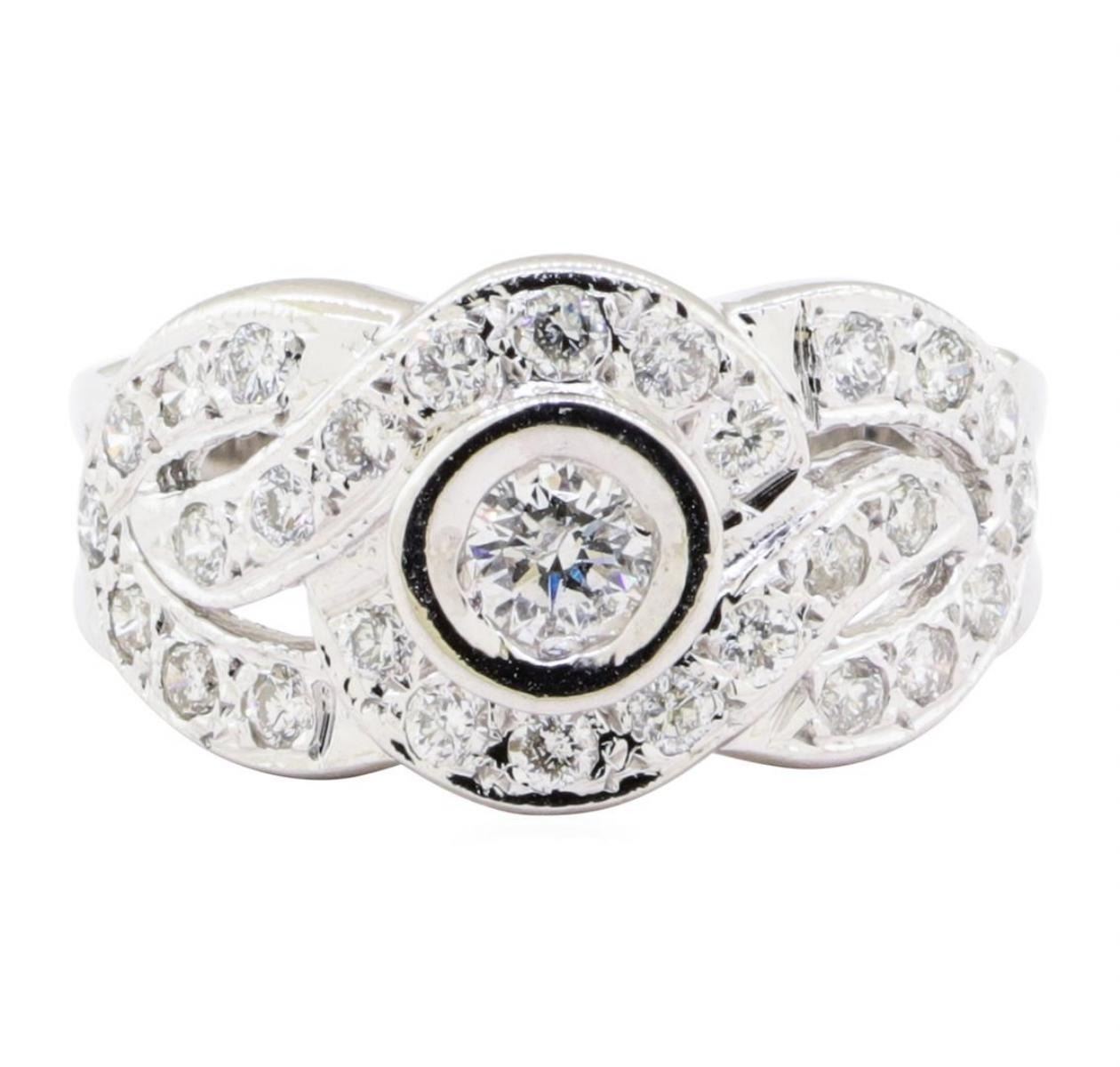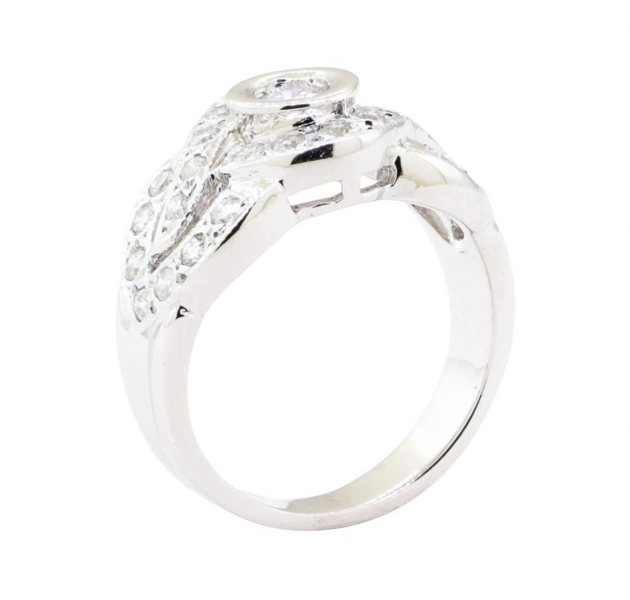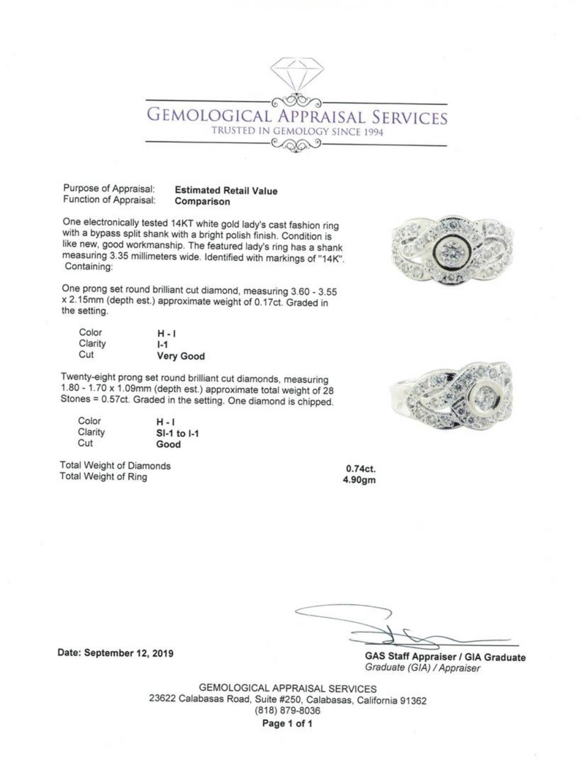 One electronically tested 14KT white gold lady's cast fashion ring with a bypass split shank with a bright polish finish. The featured lady's ring has a shank measuring 3.35 millimeters wide. Identified with markings of '14K'. Condition is Good. Containing: One prong set round brilliant cut diamond, measuring 3.60 - 3.55 x 2.15mm (depth est.) approximate weight of 0.17ct. Graded in the setting. Color H - I Clarity I-1 Cut Very Good Twenty-Eight prong set round brilliant cut diamonds, measuring 1.80 - 1.70 x 1.09mm (depth est.) approximate total weight of 28 Stones = 0.57ct. Graded in the setting. One diamond is chipped. Color H - I Clarity SI-1 to I-1 Cut Good. Total Weight of Diamonds 0.74ct.. Total Weight of Ring 4.90gm GAS Appraised at $2355.00. GAS Appraised.