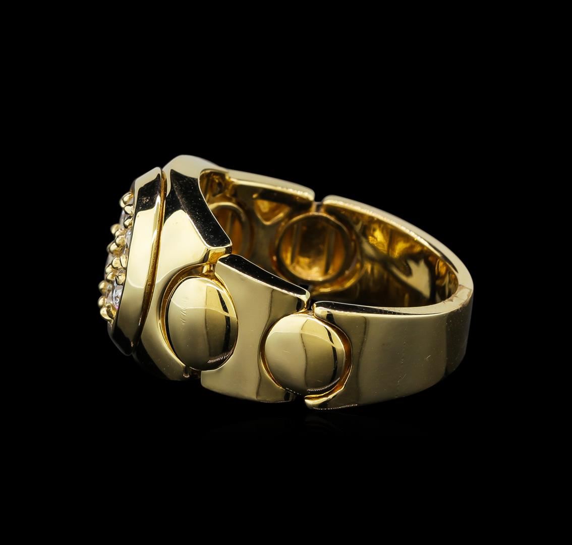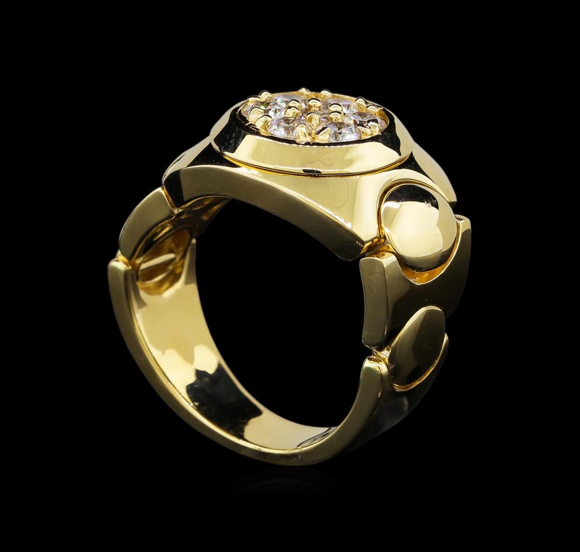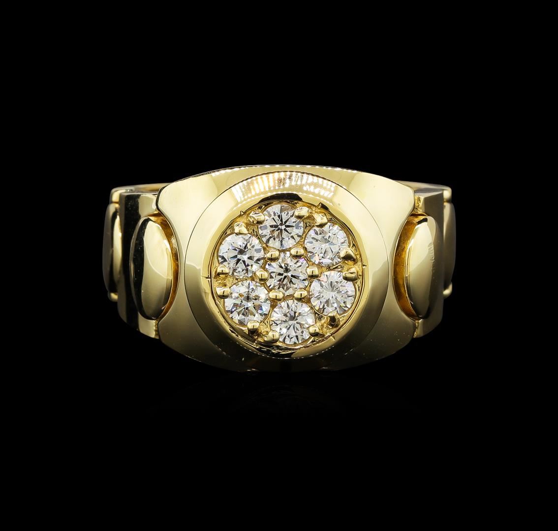 One electronically tested 14KT yellow gold man's combination cast & assembled fashion ring with a tapered shank with a bright polish finish. The featured man's ring has an assembled link motif with a shank measuring 5.45 millimeters wide. Identified with markings of '585'. Condition is new, good workmanship. Containing: Seven prong set round brilliant cut diamonds, measuring 3.10 - 3.00 x 1.89mm (depth est.) approximate total weight of 7 Stones = 0.74ct. Graded in the setting. Clarity VS-2 to SI-1. Color: I - J Cut Good. Total Weight of Diamonds 0.74ct.. Total Weight of Ring 13.80gm. GAS Appraised at $4,160.00.