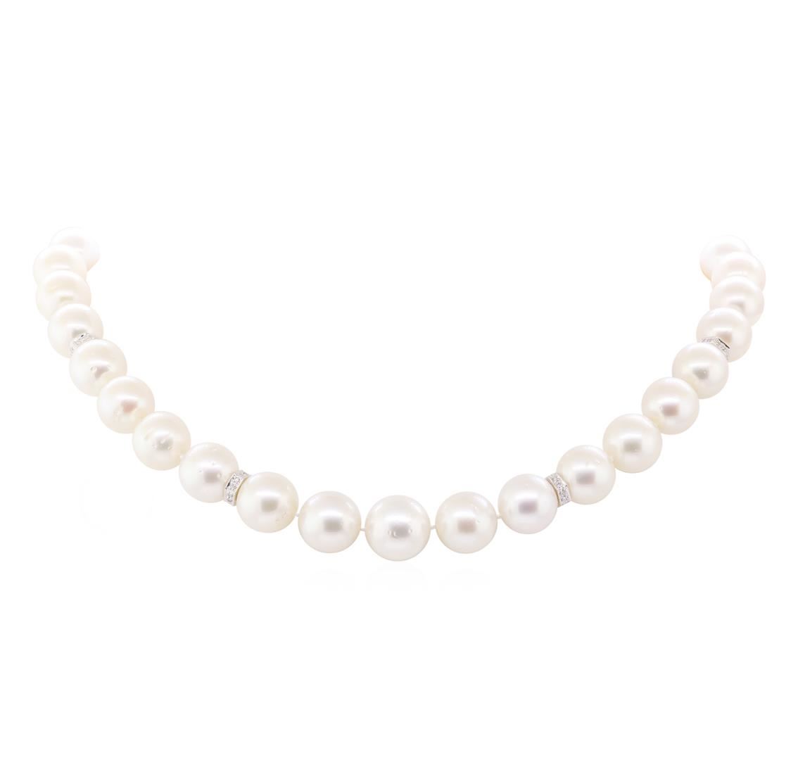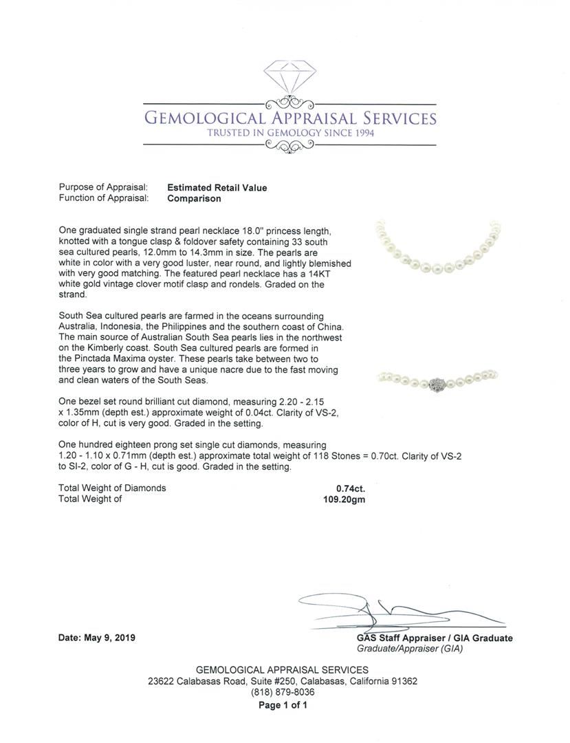 One graduated single strand pearl necklace 18.0' princess length, knotted with a tongue clasp & foldover safety containing 33 south sea cultured pearls, 12.0mm to 14.3mm in size. The pearls are white in color with a very good luster, near round, and lightly blemished with very good matching. The featured pearl necklace has a 14KT white gold vintage clover motif clasp and rondels. Graded on the strand.South Sea cultured pearls are farmed in the oceans surrounding Australia, Indonesia, the Philippines and the southern coast of China. The main source of Australian South Sea pearls lies in the northwest on the Kimberly coast. South Sea cultured pearls are formed in the Pinctada Maxima oyster. These pearls take between two to three years to grow and have a unique nacre due to the fast moving and clean waters of the South Seas. One bezel set round brilliant cut diamond, measuring 2.20 - 2.15 x 1.35mm (depth est.) approximate weight of 0.04ct. Graded in the setting. Color H Clarity VS-2 Cut Very Good One Hundred Eighteen prong set single cut diamonds, measuring 1.20 - 1.10 x 0.71mm (depth est.) approximate total weight of 118 Stones = 0.70 ct. Graded in the setting. Color G - H Clarity VS-2 to SI-2 Cut Good. Total Weight of Diamonds 0.74ct.. Total Weight of 109.20gm GAS Appraised at $23860.00.