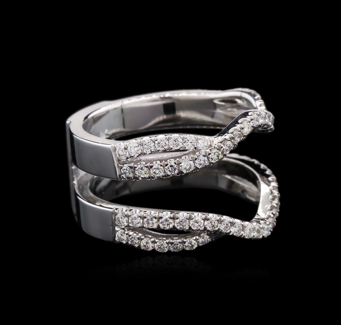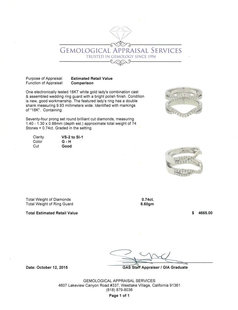 One electronically tested 18KT white gold lady's combination cast & assembled wedding ring guard with a bright polish finish. The featured lady's ring has a double shank measuring 9.93 millimeters wide. Identified with markings of "18K". Condition is new, good workmanship. Containing: Seventy-Four prong set round brilliant cut diamonds, measuring 1.40 - 1.30 x 0.88mm (depth est.) approximate total weight of 74 Stones = 0.74ct. Graded in the setting. Clarity: VS-2 to SI-1. Color: G - Good. Total Weight of Diamonds 0.74ct. Total Weight of Ring Guard 8.60gm. GAS Appraised at $4,665.00.