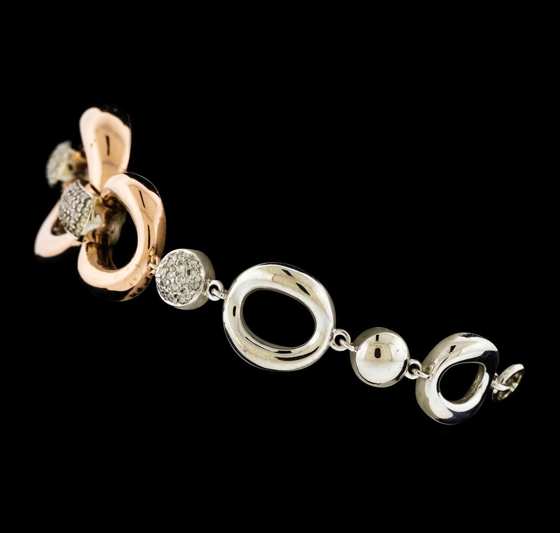 One electronically tested 14KT rose and white gold lady's combination cast & assembled fashion bracelet with a tongue clasp with foldover safety with a bright polish finish. The featured lady's bracelet has seven connected oval links graduating from small to large at the center and measures approximately 8 inches in length. Identified with markings of '14K'. Condition is new, good workmanship. Containing: Thirty-Eight prong set round brilliant cut diamonds, measuring 1.25 - 1.15 x 0.74mm (depth est.) approximate total weight of 38 Stones = 0.25ct. Graded in the setting. Clarity SI-1 to I-1. Color: H - I Cut Good Ninety-Eight prong set round brilliant cut diamonds, measuring 1.15 - 1.05 x 0.68mm (depth est.) approximate total weight of 98 Stones = 0.50ct. Graded in the setting. Clarity SI-1 to I-1. Color: H - I Cut Good. Total Weight of Diamonds 0.75ct.. Total Weight of Bracelet 15.20gm. GAS Appraised at $5,370.00.