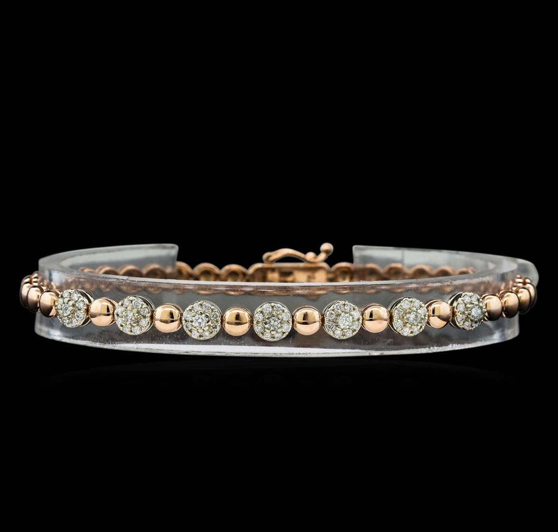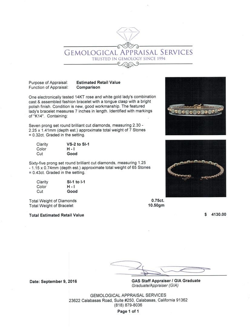 One electronically tested 14KT rose and white gold lady's combination cast & assembled fashion bracelet with a tongue clasp with a bright polish finish. The featured lady's bracelet measures 7 inches in length. Identified with markings of 'K14'. Condition is new, good workmanship. Containing: Seven prong set round brilliant cut diamonds, measuring 2.30 - 2.25 x 1.41mm (depth est.) approximate total weight of 7 Stones = 0.32ct. Graded in the setting. Clarity VS-2 to SI-1. Color: H - I Cut Good Sixty-Five prong set round brilliant cut diamonds, measuring 1.25 - 1.15 x 0.74mm (depth est.) approximate total weight of 65 Stones = 0.43ct. Graded in the setting. Clarity SI-1 to I-1. Color: H - I Cut Good. Total Weight of Diamonds 0.75ct.. Total Weight of Bracelet 10.50gm GAS Appraised at $4,130.00.