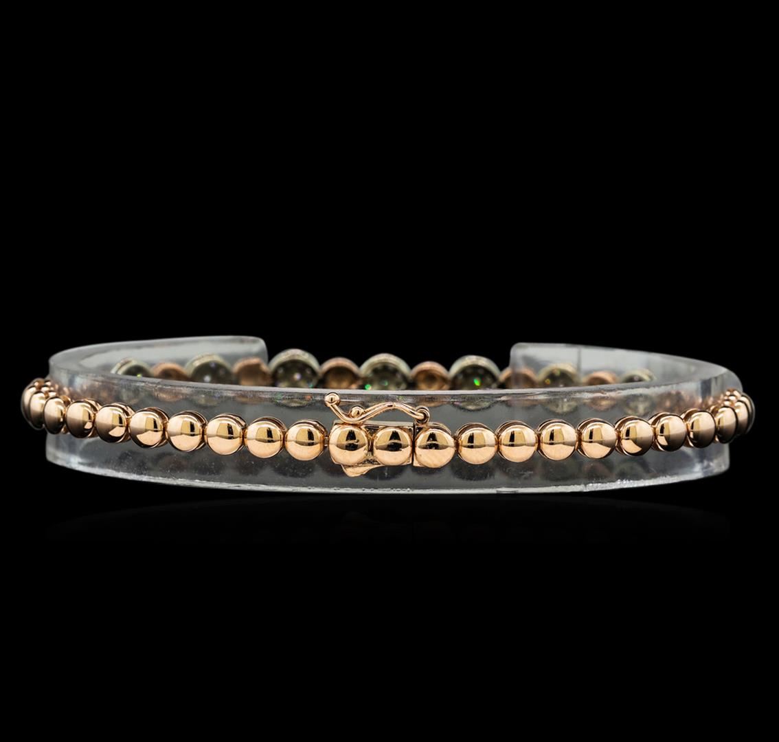 One electronically tested 14KT rose and white gold lady's combination cast & assembled fashion bracelet with a tongue clasp with a bright polish finish. The featured lady's bracelet measures 7 inches in length. Identified with markings of 'K14'. Condition is new, good workmanship. Containing: Seven prong set round brilliant cut diamonds, measuring 2.30 - 2.25 x 1.41mm (depth est.) approximate total weight of 7 Stones = 0.32ct. Graded in the setting. Clarity VS-2 to SI-1. Color: H - I Cut Good Sixty-Five prong set round brilliant cut diamonds, measuring 1.25 - 1.15 x 0.74mm (depth est.) approximate total weight of 65 Stones = 0.43ct. Graded in the setting. Clarity SI-1 to I-1. Color: H - I Cut Good. Total Weight of Diamonds 0.75ct.. Total Weight of Bracelet 10.50gm GAS Appraised at $4,130.00.