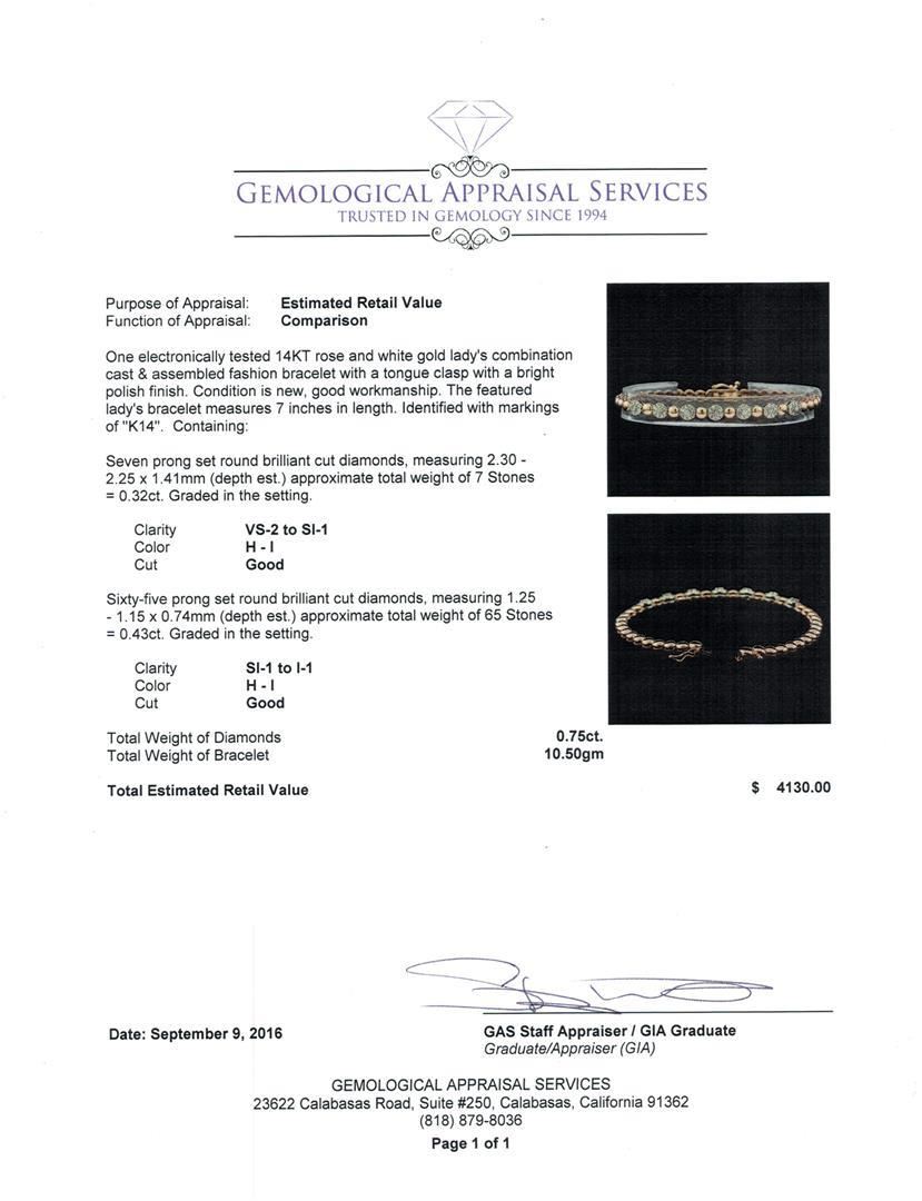 One electronically tested 14KT rose and white gold lady's combination cast & assembled fashion bracelet with a tongue clasp with a bright polish finish. The featured lady's bracelet measures 7 inches in length. Identified with markings of 'K14'. Condition is new, good workmanship. Containing: Seven prong set round brilliant cut diamonds, measuring 2.30 - 2.25 x 1.41mm (depth est.) approximate total weight of 7 Stones = 0.32ct. Graded in the setting. Clarity VS-2 to SI-1. Color: H - I Cut Good Sixty-Five prong set round brilliant cut diamonds, measuring 1.25 - 1.15 x 0.74mm (depth est.) approximate total weight of 65 Stones = 0.43ct. Graded in the setting. Clarity SI-1 to I-1. Color: H - I Cut Good. Total Weight of Diamonds 0.75ct.. Total Weight of Bracelet 10.50gm GAS Appraised.