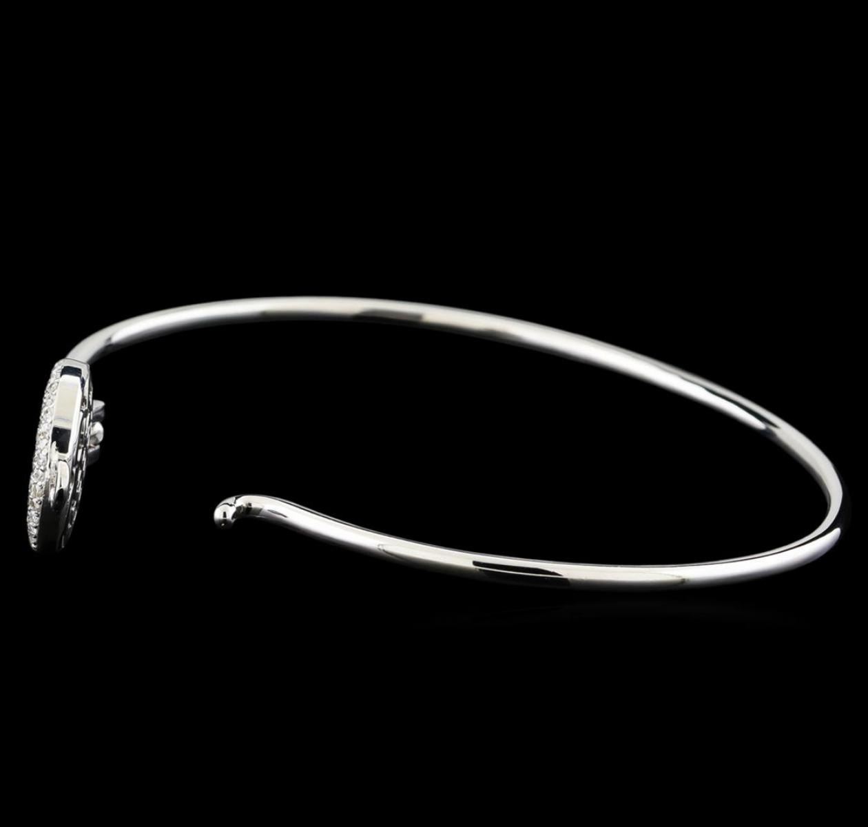 One electronically tested 14KT white gold lady's combination cast & assembled fashion bangle bracelet with a foldover clasp with a bright polish finish. The featured lady's bangle bracelet has a circumference of approximately 7 inches. Condition is new, good workmanship. Containing: One Hundred Twenty-Eight prong set round brilliant cut diamonds, measuring 1.20 - 1.10 x 0.71mm (depth est.) approximate total weight of 128 Stones = 0.75ct. Graded in the setting. Clarity: SI-1 to SI-2. Color: G - Good. Total Weight of Diamonds 0.75ct. Total Weight of Bangle Bracelet 9.90gm GAS Appraised.