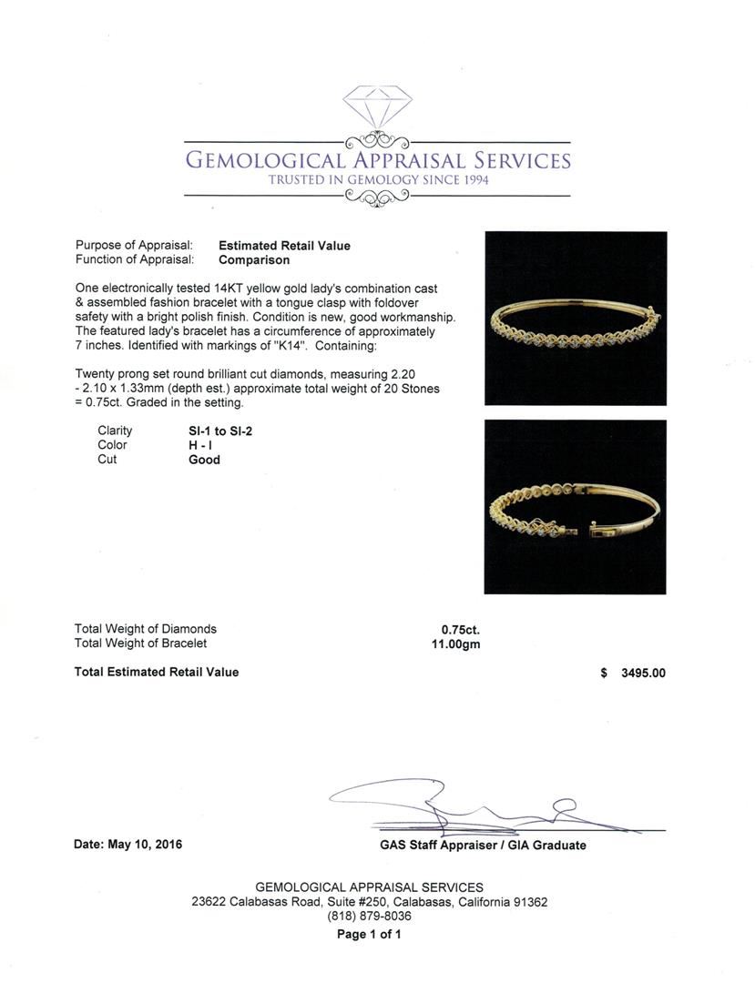 One electronically tested 14KT yellow gold lady's combination cast & assembled fashion bracelet with a tongue clasp with foldover safety with a bright polish finish. The featured lady's bracelet has a circumference of approximately 7 inches. Identified with markings of "K14". Condition is new, good workmanship. Containing: Twenty prong set round brilliant cut diamonds, measuring 2.20 - 2.10 x 1.33mm (depth est.) approximate total weight of 20 Stones = 0.75ct. Graded in the setting. Clarity: SI-1 to SI-2. Color: H - I. Cut Good. Total Weight of Diamonds 0.75ct. Total Weight of Bracelet 11.00gm. GAS Appraised at $3,495.00.