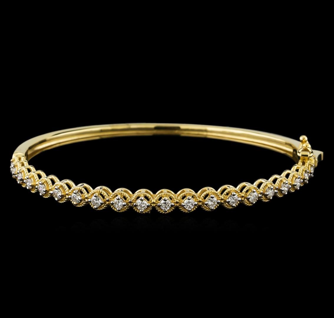 One electronically tested 14KT yellow gold lady's combination cast & assembled fashion bracelet with a tongue clasp with foldover safety with a bright polish finish. The featured lady's bracelet has a circumference of approximately 7 inches. Identified with markings of "K14". Condition is new, good workmanship. Containing: Twenty prong set round brilliant cut diamonds, measuring 2.20 - 2.10 x 1.33mm (depth est.) approximate total weight of 20 Stones = 0.75ct. Graded in the setting. Clarity: SI-1 to SI-2. Color: H - I. Cut Good. Total Weight of Diamonds 0.75ct. Total Weight of Bracelet 11.00gm. GAS Appraised at $3,495.00.
