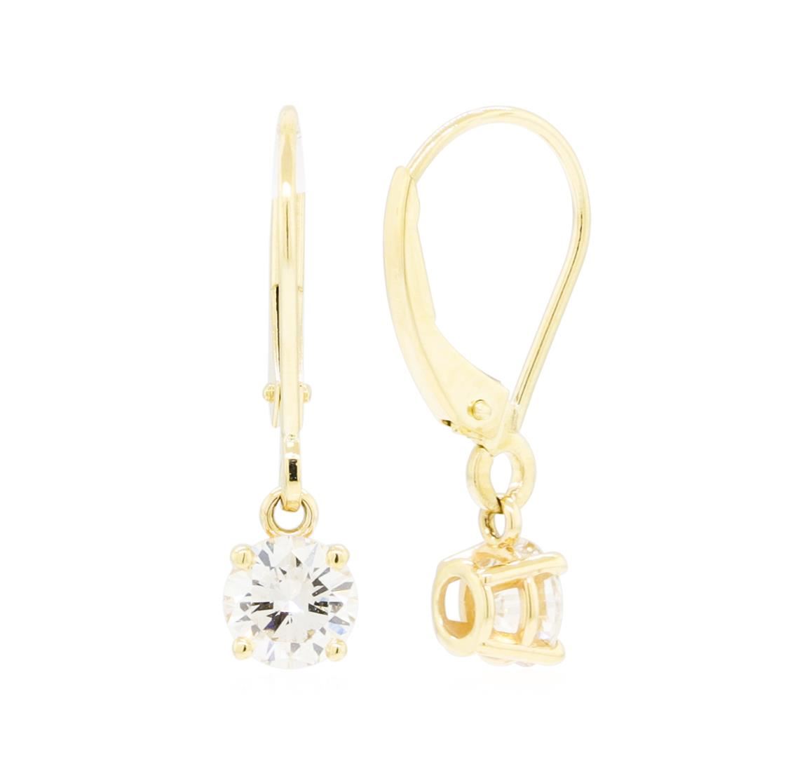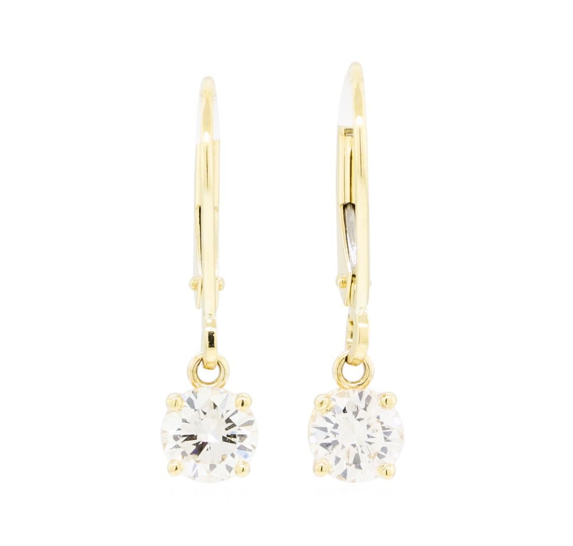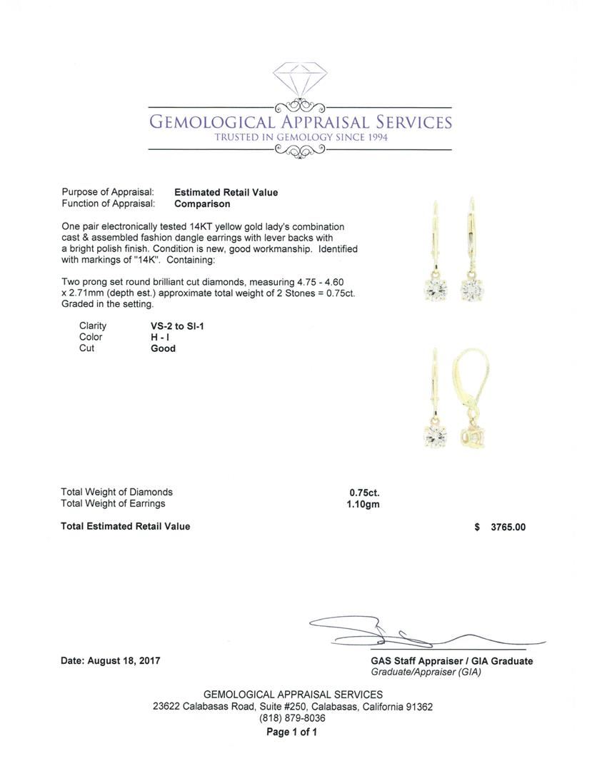 One pair electronically tested 14KT yellow gold lady's combination cast & assembled fashion dangle earrings with lever backs with a bright polish finish. Identified with markings of '14K'. Condition is new, good workmanship. Containing: Two prong set round brilliant cut diamonds, measuring 4.75 - 4.60 x 2.71mm (depth est.) approximate total weight of 2 Stones = 0.75ct. Graded in the setting. Color H - I Clarity VS-2 to SI-1 Cut Good. Total Weight of Diamonds 0.75ct.. Total Weight of Earrings 1.10gm GAS Appraised at $3765.00. GAS Appraised at $3,765.00.