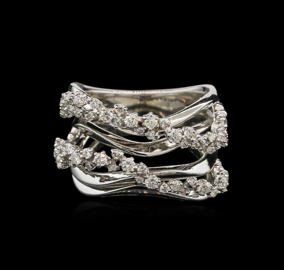 One electronically tested 14KT white gold ladies cast diamond ring with a bright polish finish. The ring features two stylized diamond ribbons floating above multiple white gold ribbon, completed by a six millimeter wide band. Identified with markings of "585". Condition is new, good workmanship. Containing: Sixty-Four prong set round brilliant cut diamonds exact total weight 64 Stones = 0.75ct. Graded in the setting. Clarity: SI-1 to I-1. Color: G - I. Total Weight of Diamonds 0.75ct. Total Weight of Ring 9.79gm. AIG Appraised at $3,885.00.