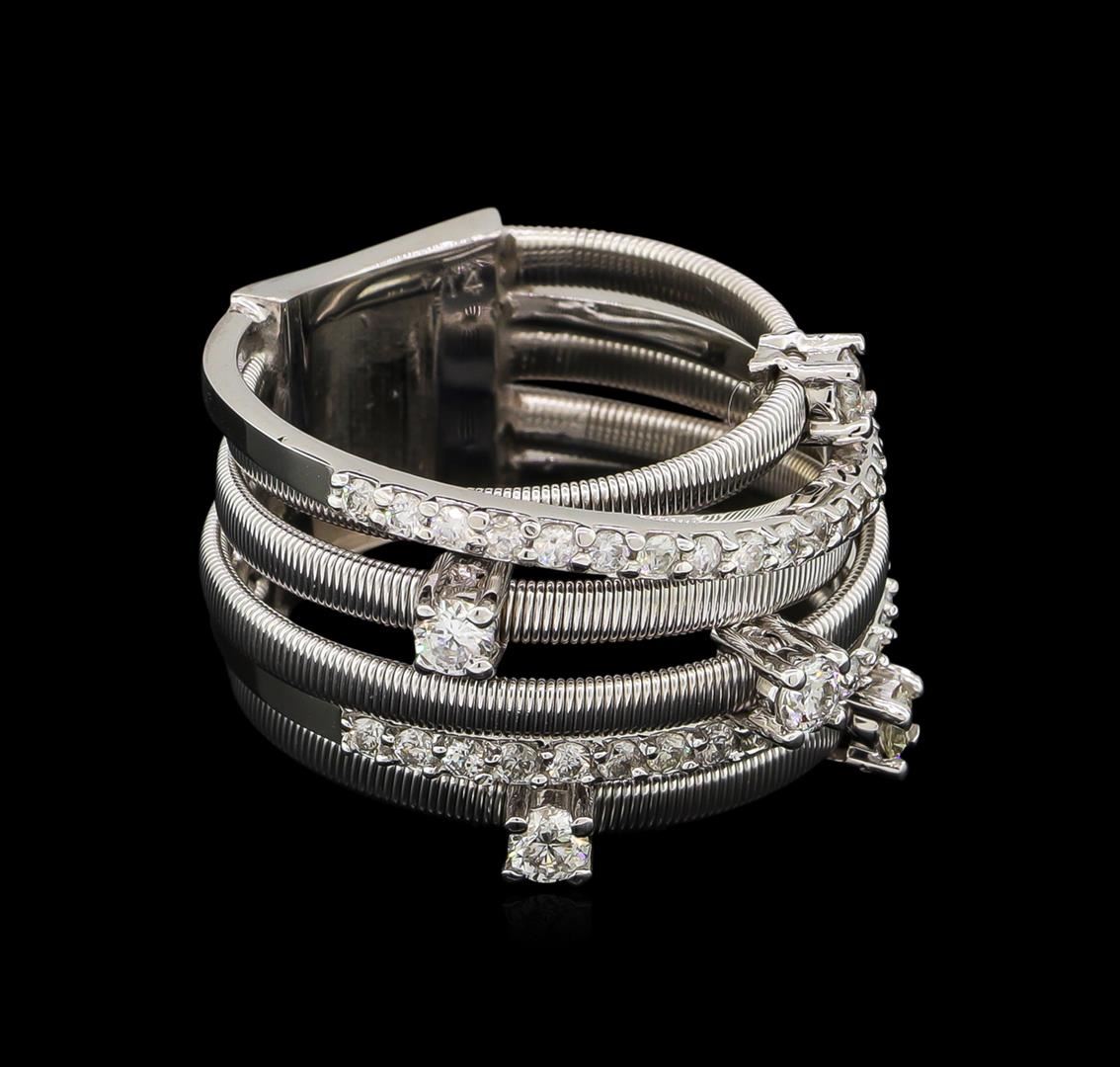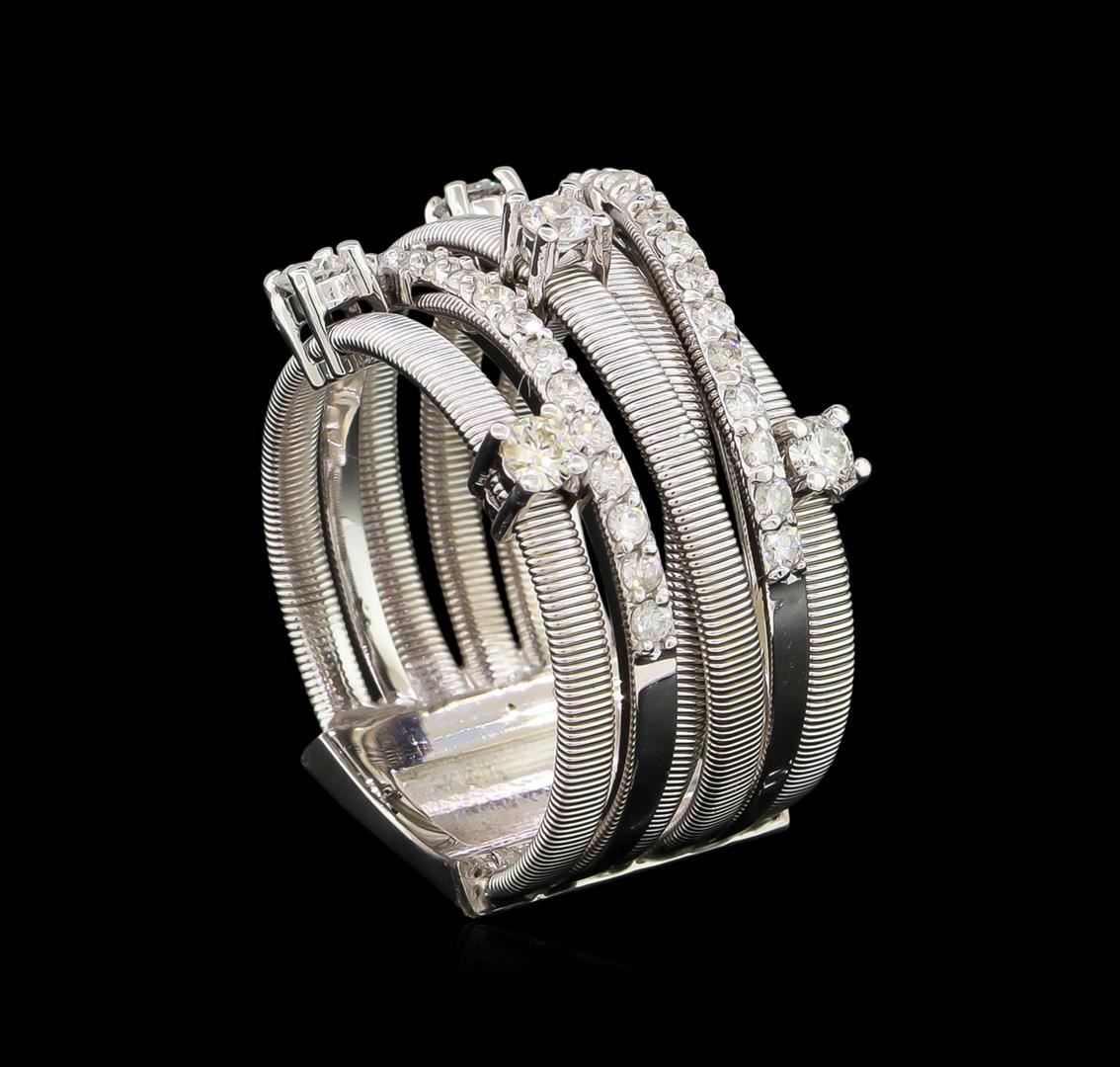 One electronically tested 14KT white gold lady's combination cast & assembled fashion ring with a wide band with a bright polish and satin finish. The featured lady's ring has six partially overlapping rows and a shank measuring 11.22 millimeters wide. Identified with markings of "K14". Condition is new, good workmanship. Containing: Five prong set round brilliant cut diamonds, measuring 2.70 - 2.60 x 1.64mm (depth est.) approximate total weight of 5 Stones = 0.35ct. Graded in the setting. Clarity: SI-1 to SI-2. Color: H - I. Cut Good Thirty-Four prong set round brilliant cut diamonds, measuring 1.50 - 1.40 x 0.90mm (depth est.) approximate total weight of 34 Stones = 0.40ct. Graded in the setting. Clarity: SI-1 to I-1. Color: H - I. Cut Good. Total Weight of Diamonds 0.75ct. Total Weight of Ring 9.80gm. GAS Appraised at $3,760.00.