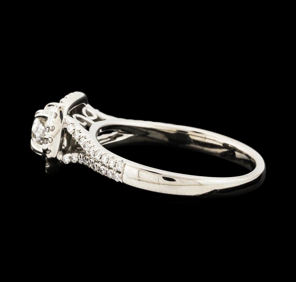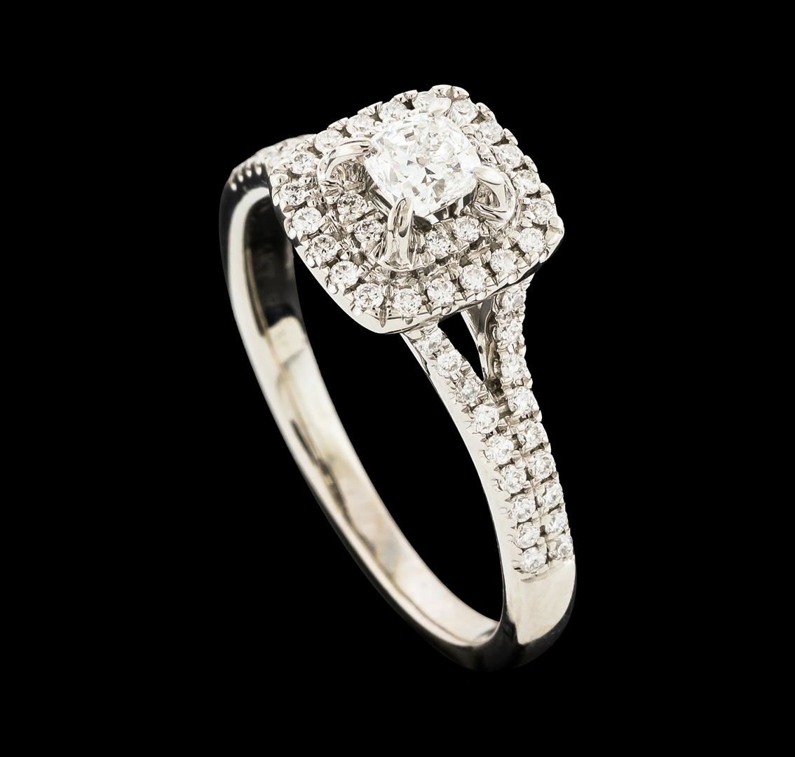One electronically tested 14KT white gold lady's cast wedding ring with a split shank double basket halo with a bright polish with milgrain detailing finish. The featured lady's ring has a shank measuring 2.06 millimeters wide. Identified with markings of '14K'. Condition is new, good workmanship. Containing: One prong set cushion cut diamond, measuring 3.89 x 3.87 x 3.10mm (depth est.) approximate weight of 0.40ct. Graded in the setting. Clarity SI-1. Color: H Cut Very Good Sixty-Four prong set round brilliant cut diamonds, measuring 1.20 - 1.10 x 0.71mm (depth est.) approximate total weight of 64 Stones = 0.35ct. Graded in the setting. Clarity VS-2 to SI-1. Color: G - I Cut Good. Total Weight of Diamonds 0.75ct.. Total Weight of Ring 4.00gm. GAS Appraised at $3,915.00.
