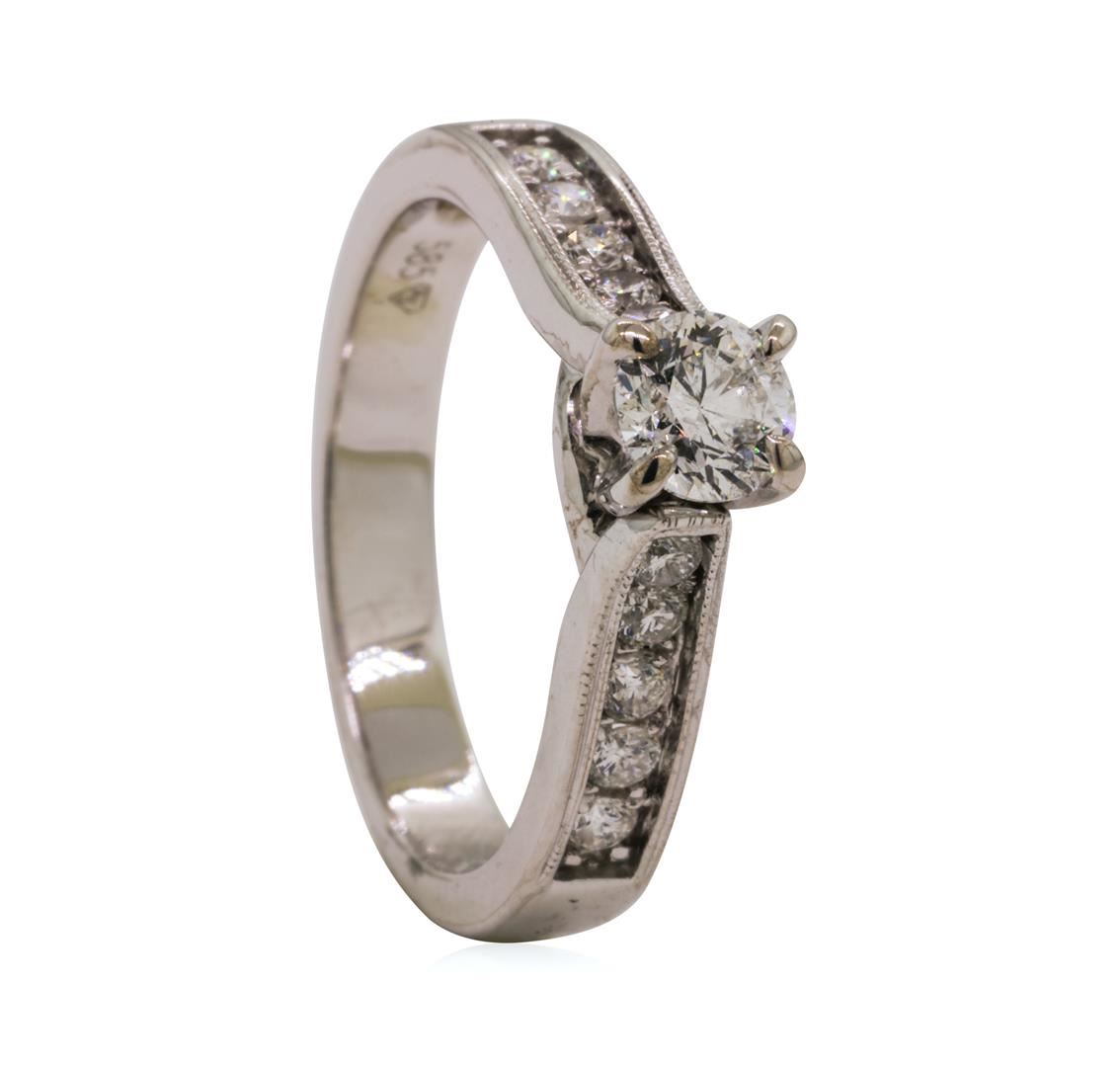 One lady's ring with a straight line cathedral motif with milgrain detailing featuring: 14KT white gold weighing 4.5 grams containing diamonds weighing 0.75ctw.