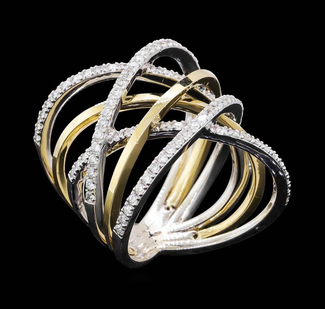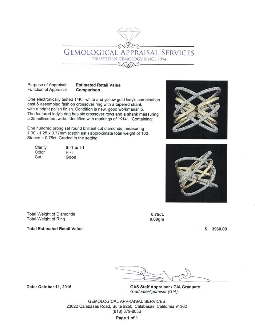 One electronically tested 14KT white and yellow gold lady's combination cast & assembled fashion crossover ring with a tapered shank with a bright polish finish. The featured lady's ring has six crossover rows and a shank measuring 5.25 millimeters wide. Identified with markings of 'K14'. Condition is new, good workmanship. Containing: One Hundred prong set round brilliant cut diamonds, measuring 1.30 - 1.25 x 0.77mm (depth est.) approximate total weight of 100 Stones = 0.75ct. Graded in the setting. Clarity SI-1 to I-1. Color: H - I Cut Good. Total Weight of Diamonds 0.75ct.. Total Weight of Ring 9.00gm. GAS Appraised at $3,960.00.