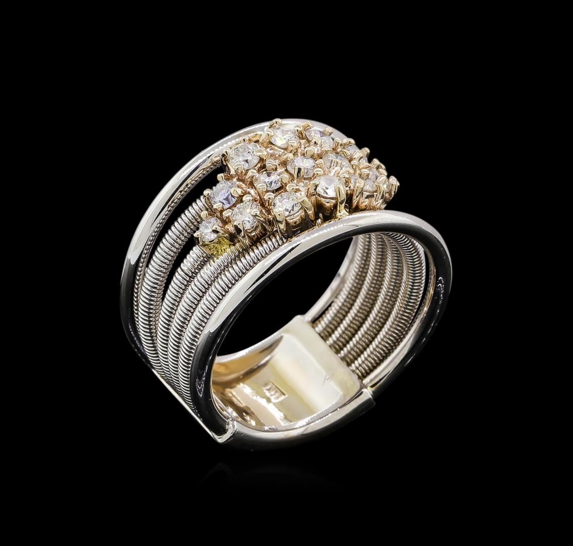 One electronically tested 14KT white and yellow gold lady's combination cast & assembled fashion ring with a wide band with a bright polish finish. The featured lady's ring has a six band motif and shank measuring 10.64 millimeters wide. Identified with markings of '14K'. Condition is new, good workmanship. Containing: Three prong set round brilliant cut diamonds, measuring 2.55 - 2.45 x 1.55mm (depth est.) approximate total weight of 3 Stones = 0.18ct. Graded in the setting. Clarity SI-2 to I-1. Color: H - I Cut Good Ten prong set round brilliant cut diamonds, measuring 2.40 - 2.30 x 1.46mm (depth est.) approximate total weight of 10 Stones = 0.51ct. Graded in the setting. Clarity SI-1 to SI-2. Color: H - I Cut Good Two prong set round brilliant cut diamonds, measuring 2.00 - 1.95 x 1.23mm (depth est.) approximate total weight of 2 Stones = 0.06ct. Graded in the setting. Clarity SI-2 to I-1. Color: H - I Cut Good. Total Weight of Diamonds 0.75ct.. Total Weight of Ring 12.90gm. GAS Appraised at $3,930.00.