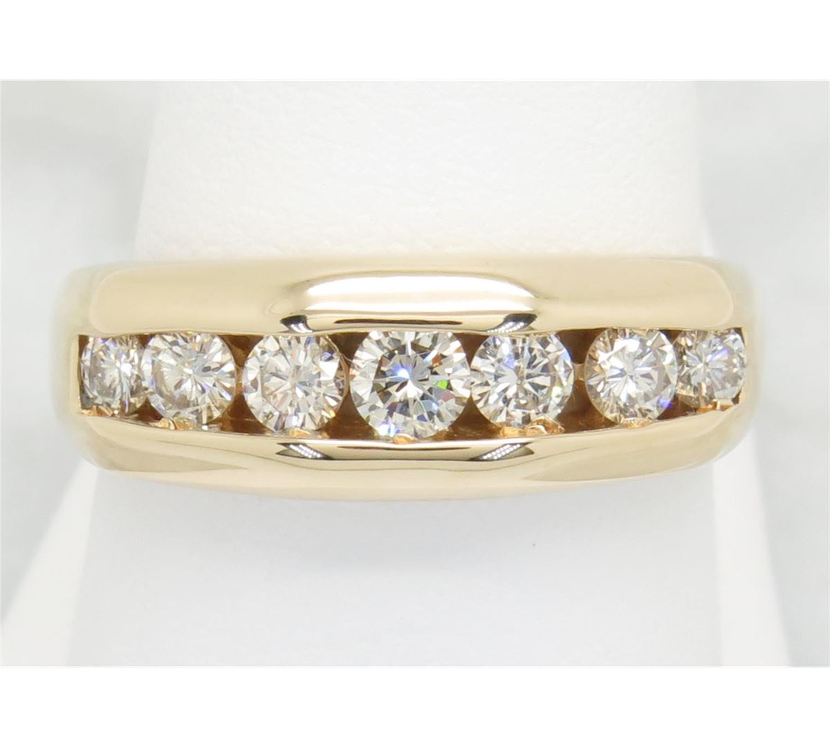 One tested 14K yellow gold diamond ring. Containing: Seven Round Brilliant Cut Diamonds. Clarity: SI, Color: J-K. Approximate total diamond weight: .75CTW. All diamonds are graded in the mounting unless otherwise stated. Weight of ring: 8.3 grams, Size: 8.25.
