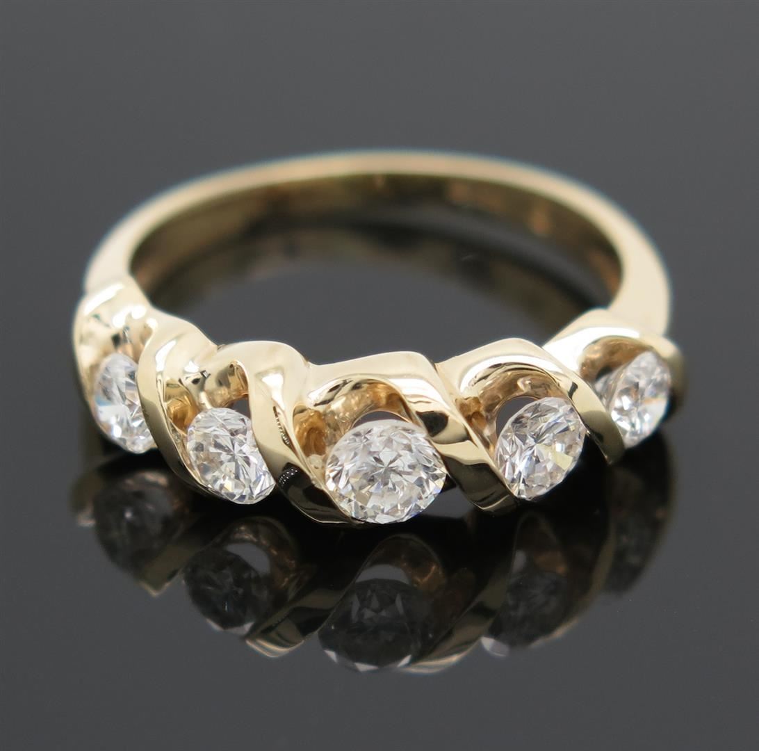 One tested 14K white gold diamond ring. Condition is new. Containing: Five Round Brilliant cut diamonds with F-H color, SI-I clarity. Approximate total diamond weight: .75CTW. Diamonds are graded in the mounting, unless otherwise stated. Weight: 4.0 grams. Size: 7.0