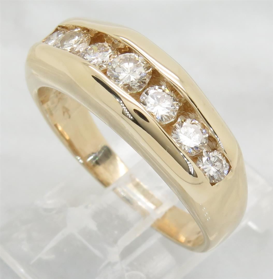 One tested 14K yellow gold diamond ring. Containing: Seven Round Brilliant Cut Diamonds. Clarity: SI, Color: J-K. Approximate total diamond weight: .75CTW. All diamonds are graded in the mounting unless otherwise stated. Weight of ring: 8.3 grams, Size: 8.25.