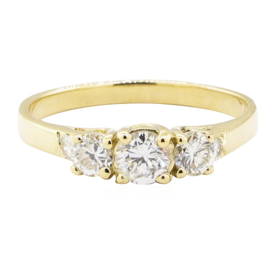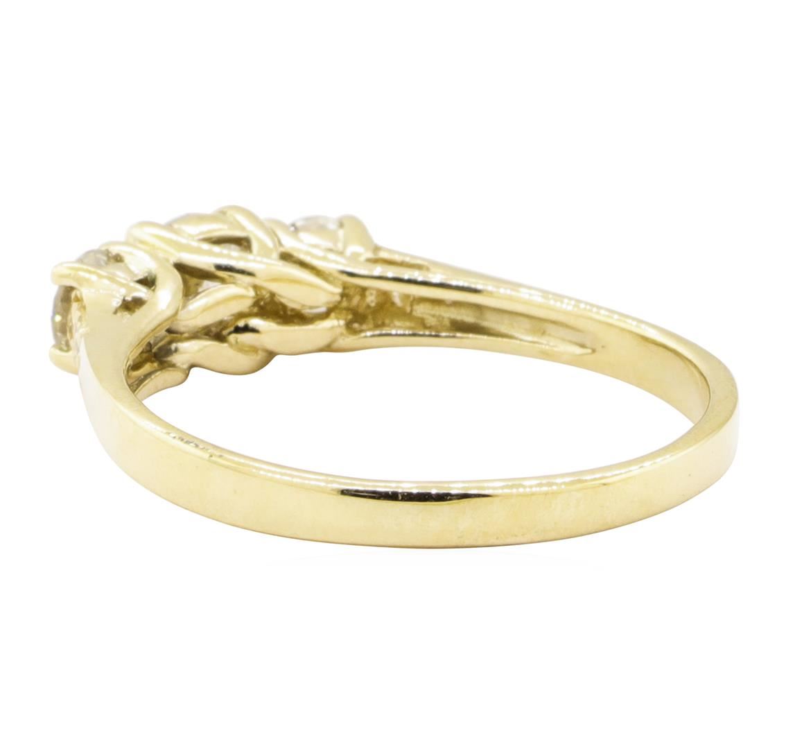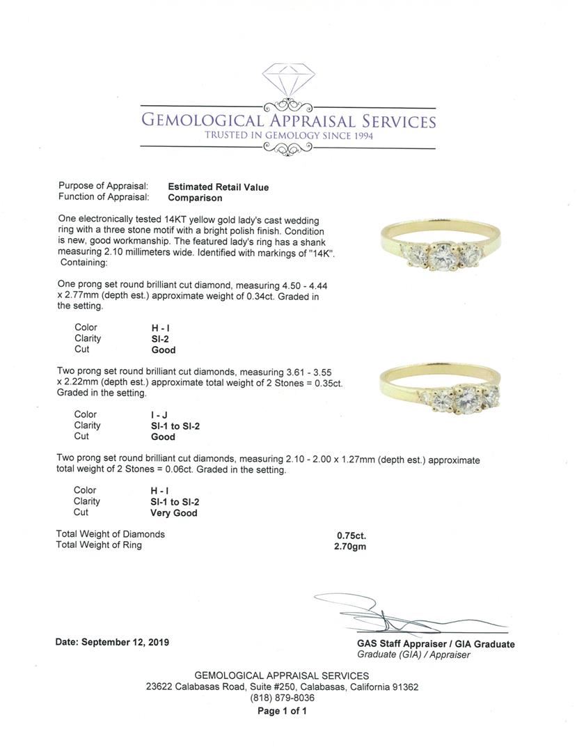 One electronically tested 14KT yellow gold lady's cast wedding ring with a three stone motif with a bright polish finish. The featured lady's ring has a shank measuring 2.10 millimeters wide. Identified with markings of '14K'. Condition is new, good workm