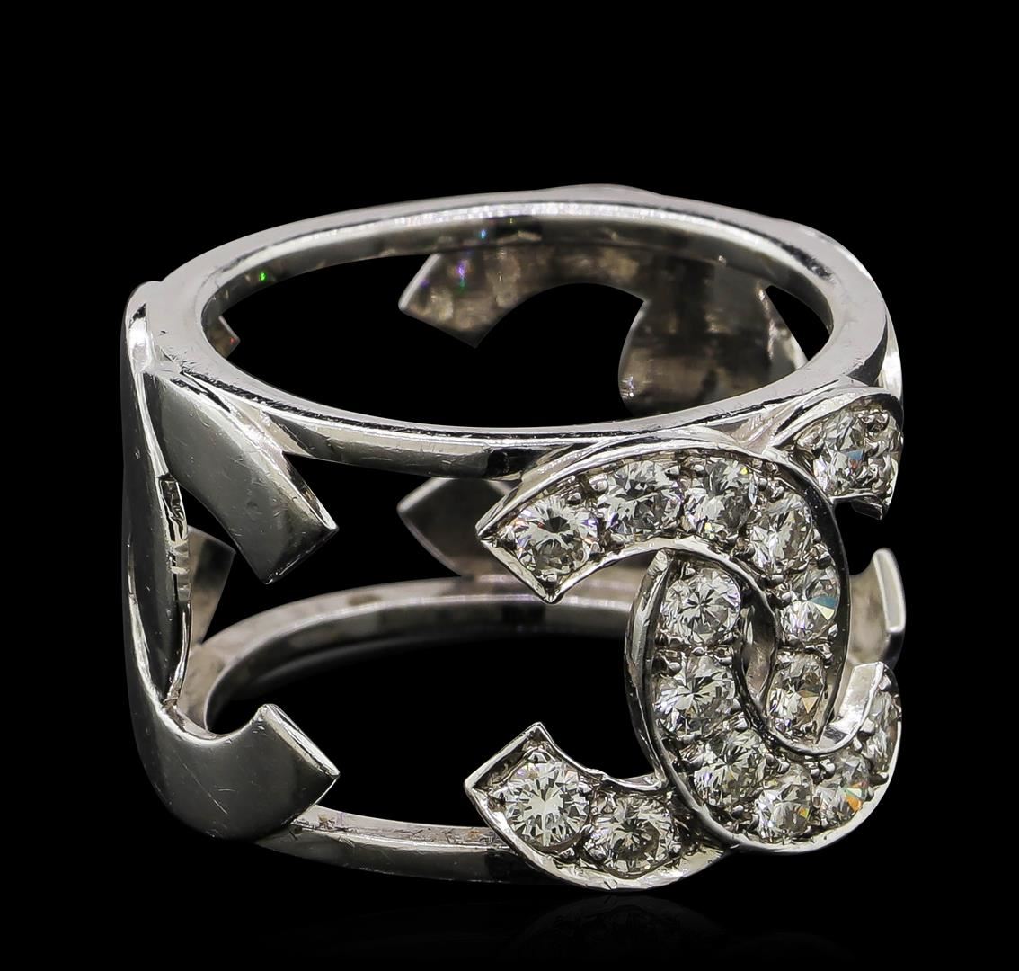 One electronically tested 18KT white gold lady's cast fashion ring with a double shank with a bright polish finish. The featured lady's ring contains three interlocking 'C' motifs and has a double shank measuring 12.71 millimeters wide. Identified with markings of '750'. Condition is used, good workmanship. Containing: Sixteen bead set round brilliant cut diamonds, measuring 2.35 - 2.25 x 1.40mm (depth est.) approximate total weight of 16 Stones = 0.75ct. Graded in the setting. Clarity VS-2 to SI-1. Color: G - H Cut Good. Total Weight of Diamonds 0.75ct.. Total Weight of Ring 6.80gm. GAS Appraised at $3,490.00.