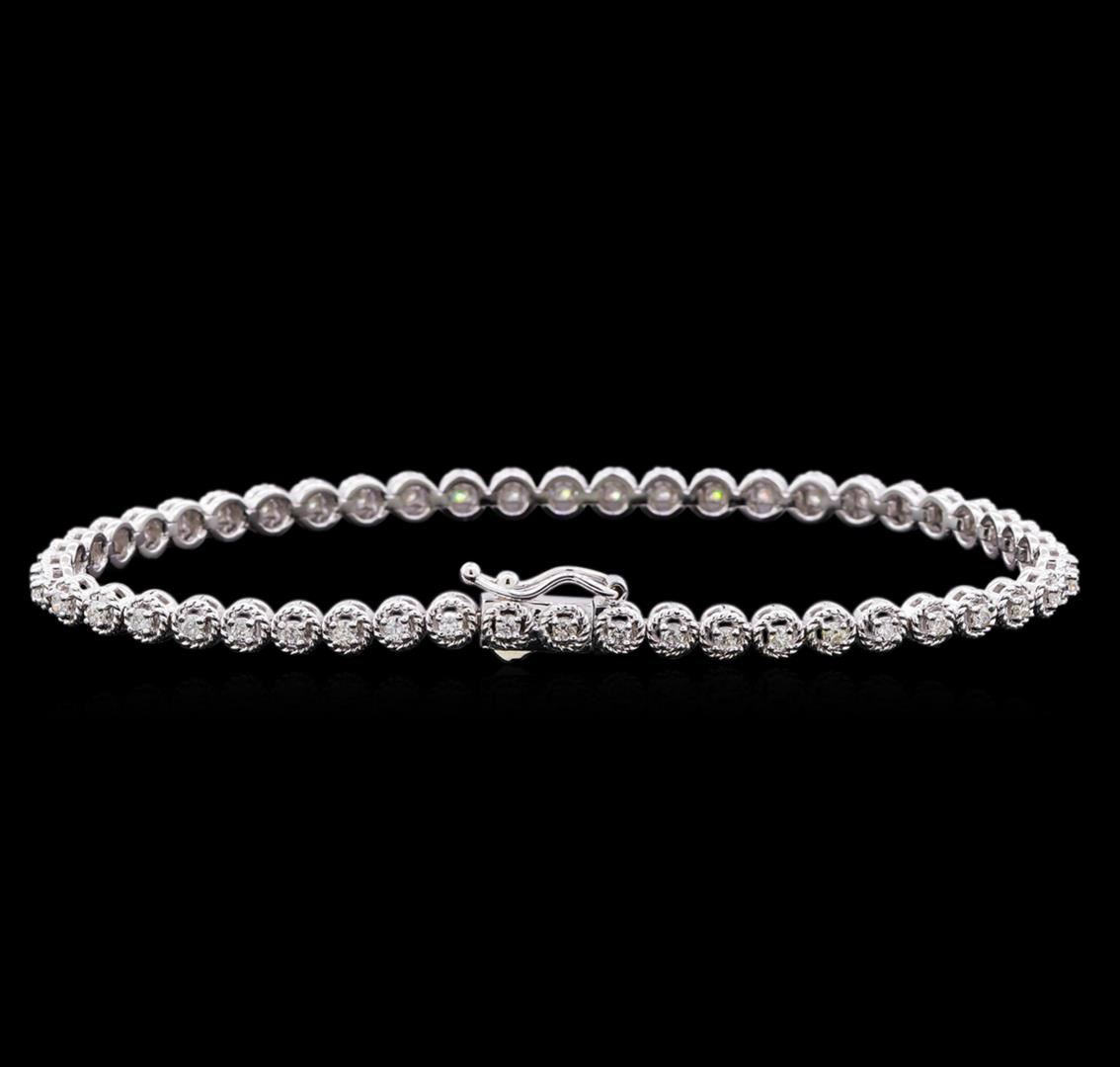 One electronically tested 14KT white gold lady's combination cast & assembled fashion tennis bracelet with a tongue clasp with foldover safety with a bright polish finish. The featured lady's bracelet has a twisted wire halo motif and measures 7 inches in length. Identified with markings of "K14". Condition is new, good workmanship. Containing: Fifty prong set round brilliant cut diamonds, measuring 1.60 - 1.55 x 0.98mm (depth est.) approximate total weight of 50 Stones = 0.75ct. Graded in the setting. Clarity: SI-1 to SI-2. Color: G - Good. Total Weight of Diamonds 0.75ct. Total Weight of Tennis Bracelet 8.20gm. GAS Appraised at $3,495.00.
