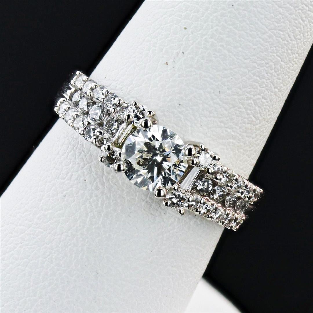 0.75ct H COLOR CENTER Diamond Platinum Ring (1.37ctw Diamonds). Name of Article: Lady's Diamond Ring Setting: Platinum Mounting [5.80 gms] Cut: Round Brilliant Color: H Clarity: I1 Measurements: 5.68 - 5.70 x 3.70mm Approximate Weight: 0.75 Carat Additional Stones/Information: 28 Round Brilliant and 2 Baguette Cut Diamonds = Approx. 0.62 Cts. TWT (Color: H-I, Clarity: SI-I1)