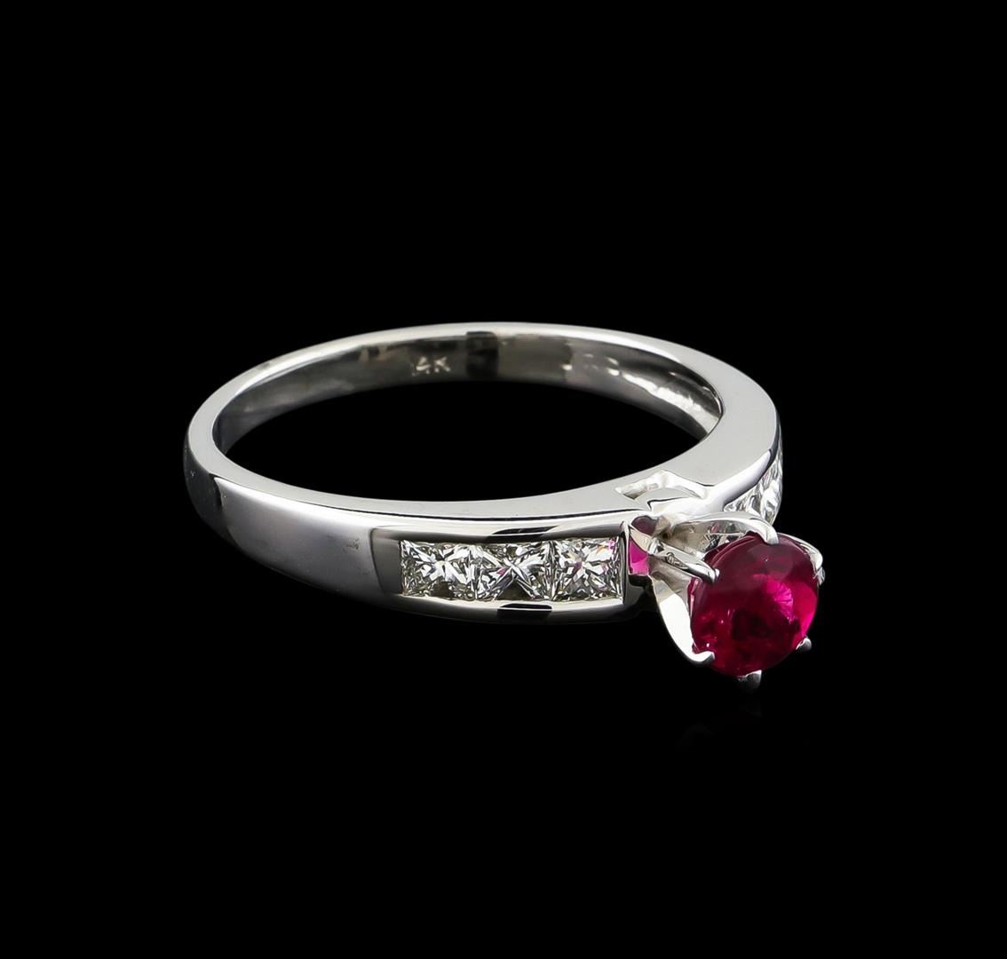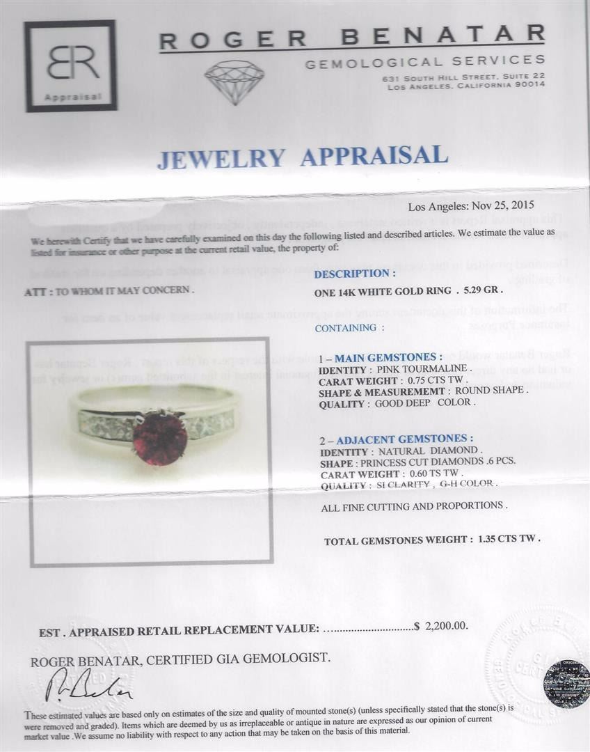 One 14KT white gold ring weighing 5.29 grams. Containing: One round shape pink tourmaline with a total weight of 0.75ct. The pink tourmaline has a clarity of good deep color. The ring also contains six princess cut natural diamonds with a total weight of 0.60ct. The diamonds have a clarity of SI and a color range of G-H. All fine cutting and proportions. RBGS Appraised at $2,200.00.