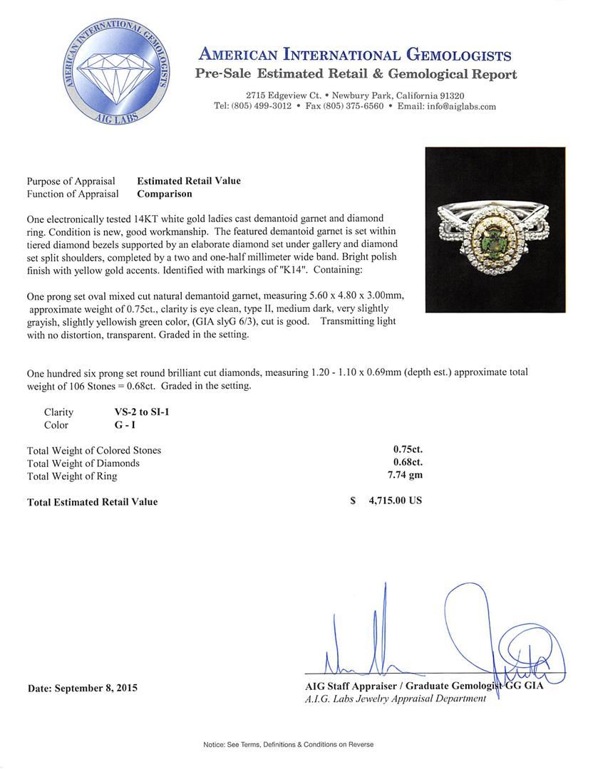 One electronically tested 14KT white gold ladies cast demantoid garnet and diamond ring. The featured demantoid garnet is set within tiered diamond bezels supported by an elaborate diamond set under gallery and diamond set split shoulders, completed by a two and one-half millimeter wide band. Bright polish finish with yellow gold accents. Identified with markings of "K14". Condition is new, good workmanship. Containing: One prong set oval mixed cut natural demantoid garnet, measuring 5.60 x 4.80 x 3.00mm, approximate weight of 0.75ct., clarity is eye clean, type II, medium dark, very slightly grayish, slightly yellowish green color, (GIA slyG 6/3), cut is good. Transmitting light with no distortion, transparent. Graded in the setting. One Hundred Six prong set round brilliant cut diamonds, measuring 1.20 - 1.10 x 0.69mm (depth est.) approximate total weight of 106 Stones = 0.68ct. Graded in the setting. Clarity: VS-2 to SI-1. Color: G - I. Total Weight of Colored Stones 0.75ct. Total Weight of Diamonds 0.68ct. Total Weight of Ring 7.74gm. AIG Appraised at $4,715.00.