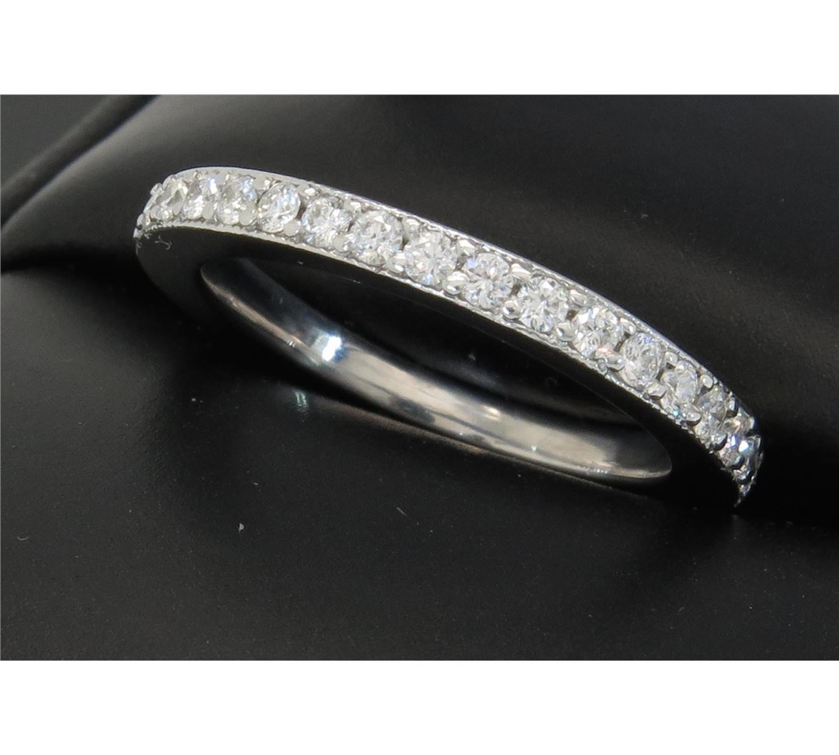 One tested 14K white gold diamond eternity band. Containing: 36 Round Brilliant Cut Diamonds. Clarity: I-SI, Color: F-G. Approximate total diamond weight: .75CTW. Diamonds are graded in the mounting, unless otherwise stated. Weight of ring: 3.2 grams. Size: 4.5.