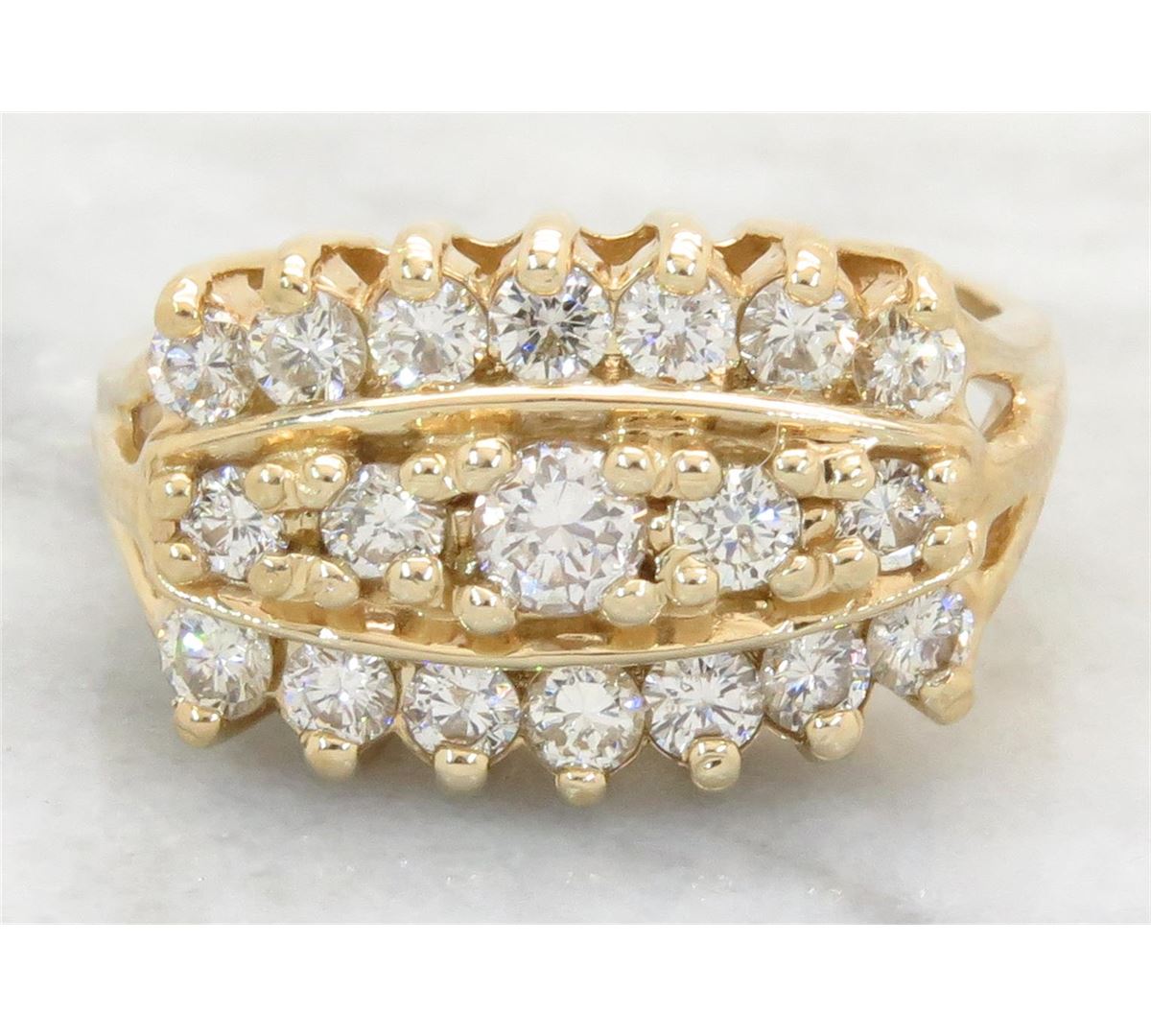 One tested 14K yellow gold diamond ring. Containing: 19 Round Brilliant Cut Diamonds. Approximate total diamond weight: .75CTW. Diamonds are graded in the mounting, unless otherwise stated. Weight: 4.9 grams, Size: 4.5.