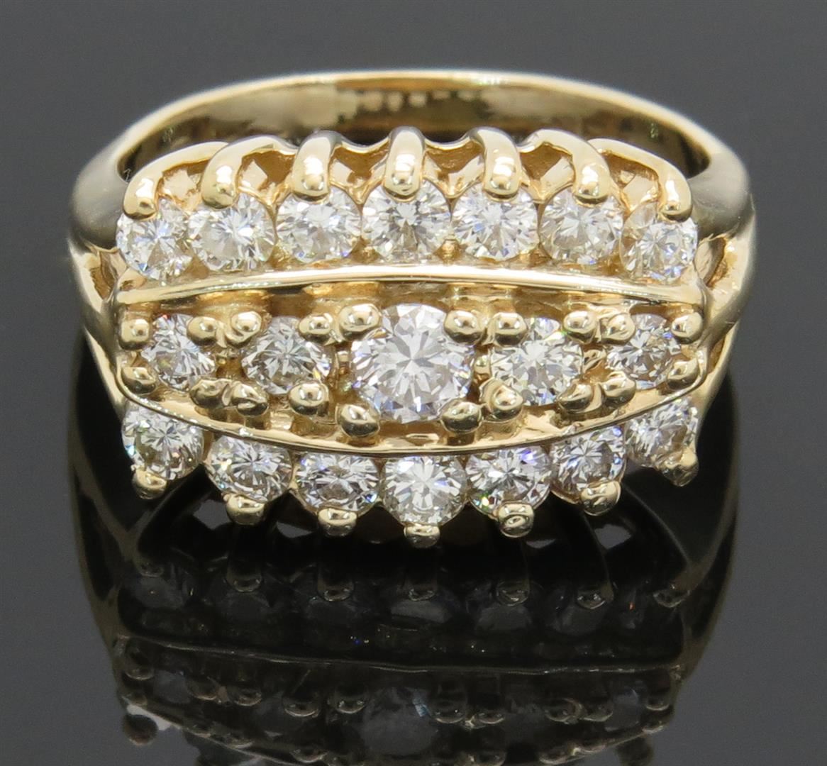 One tested 14K yellow gold diamond ring. Containing: 19 Round Brilliant Cut Diamonds. Approximate total diamond weight: .75CTW. Diamonds are graded in the mounting, unless otherwise stated. Weight: 4.9 grams, Size: 4.5.