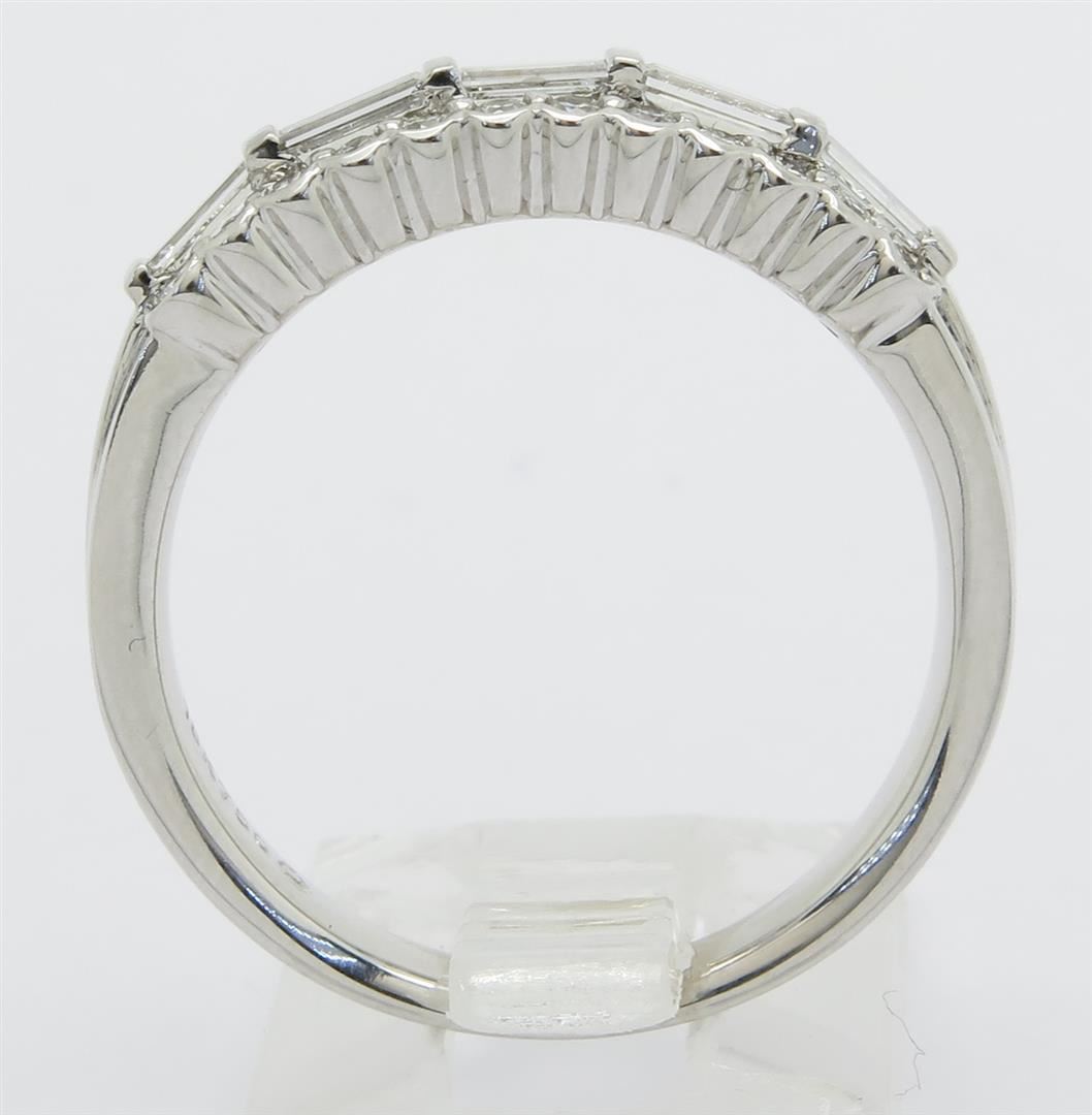 One tested 18K white gold diamond ring. Condition is new. Containing: 24 Round Brilliant Cut Diamonds, 5 Baguette Cut Diamonds. Clarity: SI, Color: G-H. Approximate total diamond weight: .75CTW. Diamonds are graded in the mounting, unless otherwise stated. Weight: 5.7 grams. Size: 7.0