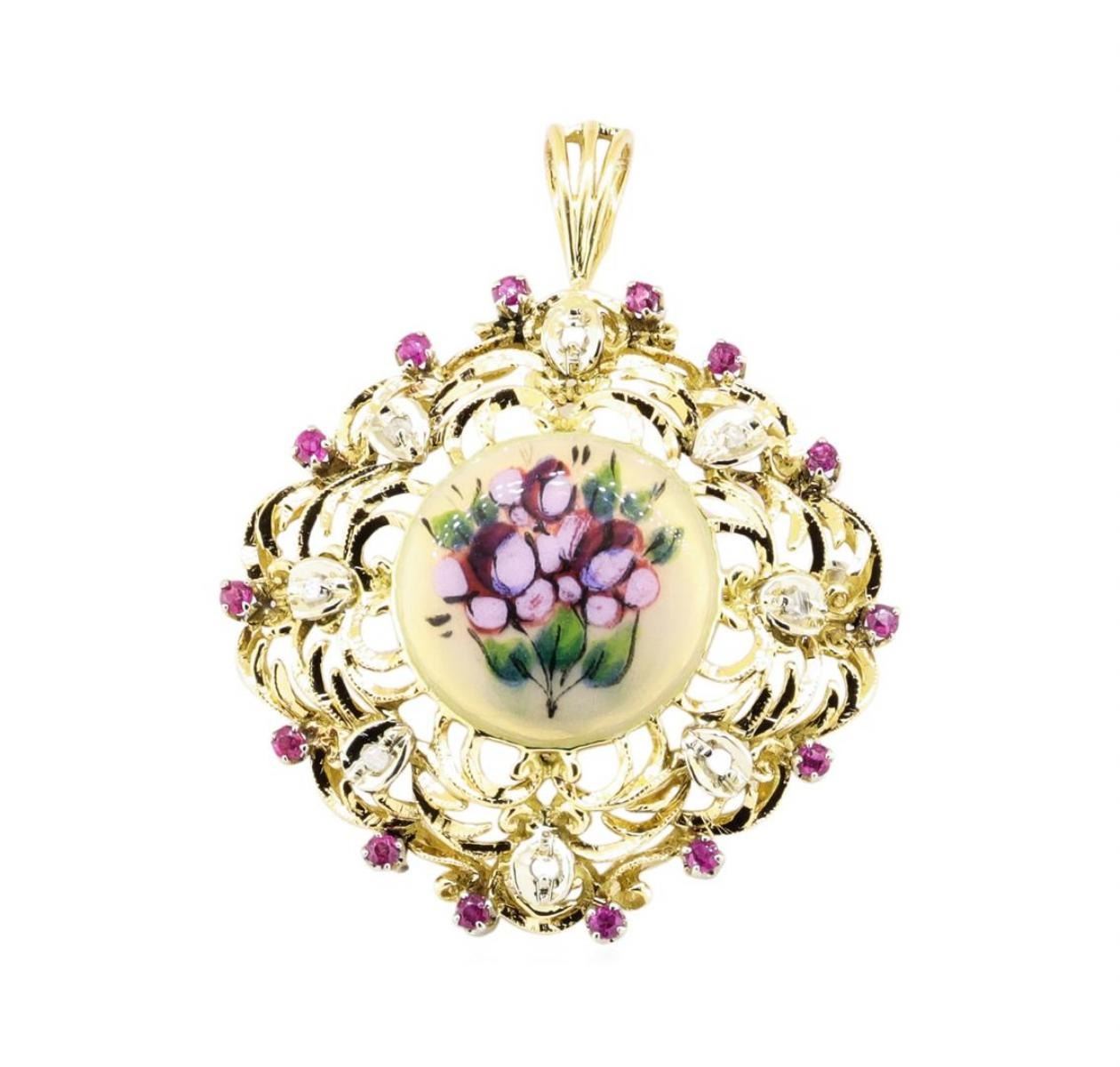 One electronically tested 18KT yellow and white gold lady's combination cast & assembled fashion vintage pendant-pin with a bright polish with milgrain detailing finish. The featured pendant-pin has a drop of approximately 46 millimeters and contains one circular piece of hand-painted crystal featuring purple flowers. Identified with markings of '750'. Condition is Good. Containing: Fourteen prong set round modified mixed cut natural rubies, measuring 2.10 - 2.00 x 1.33 mm, (depth est.) approximate total weight of 0.70 ct., clarity is slightly included, medium, strong, slightly purplish red color, (GIA slpR 5/5), cut is good. Transmitting light with a minimum of distortion, transparent. Colored gemstones are presumed to have been subjected to commonly used enhancement processes. Graded in the setting. Eight prong set rose cut diamonds, measuring 1.50 - 1.30 x 0.87mm (depth est.) approximate total weight of 8 Stones = 0.06ct. Graded in the setting. Color G - H Clarity SI-2 to I-1 Cut Poor. Total Weight of Colored Stones 0.70 ct.. Total Weight of Diamonds 0.06ct.. Total Weight of Pendant-Pin 11.80gm GAS Appraised at $3515.00. GAS Appraised.