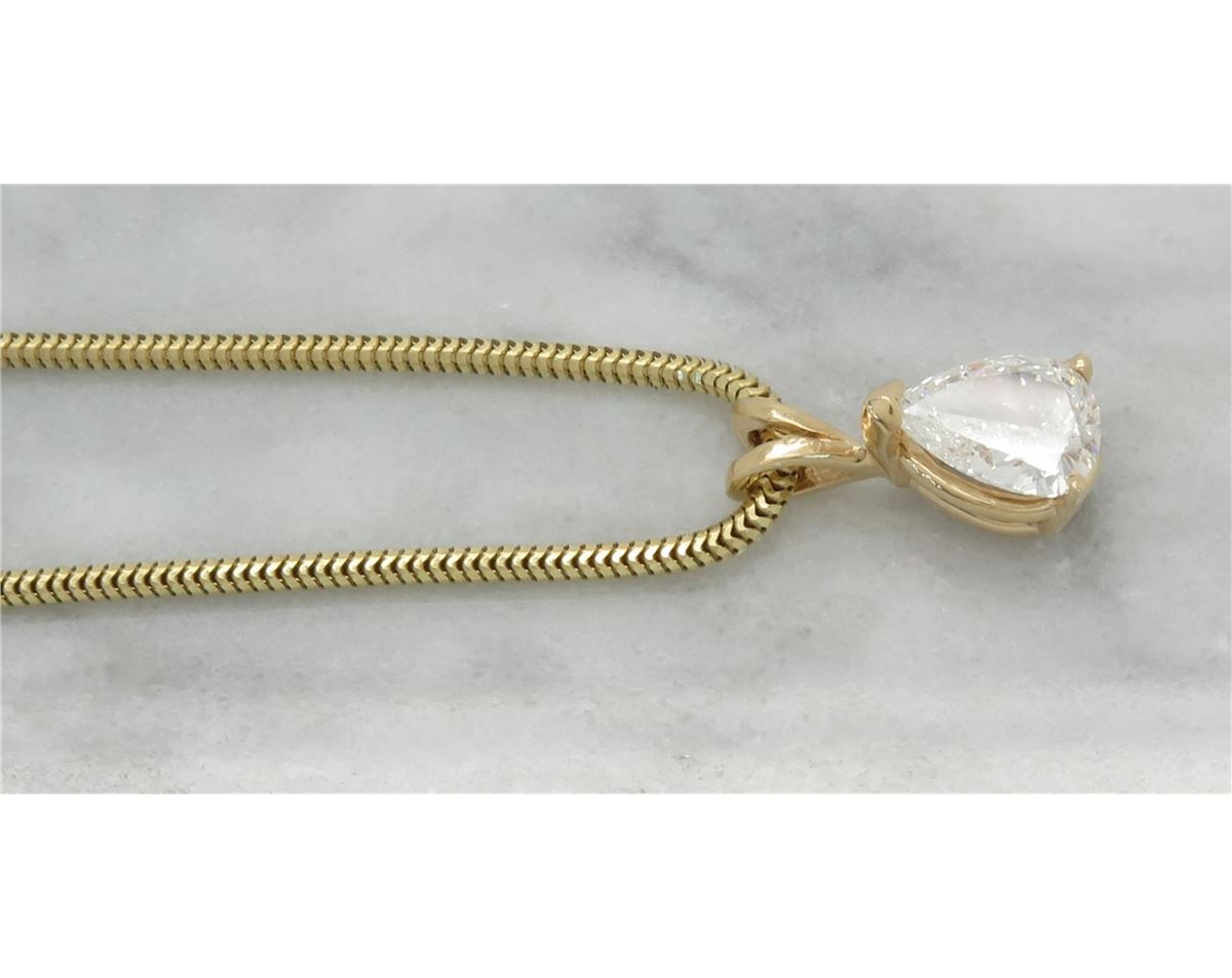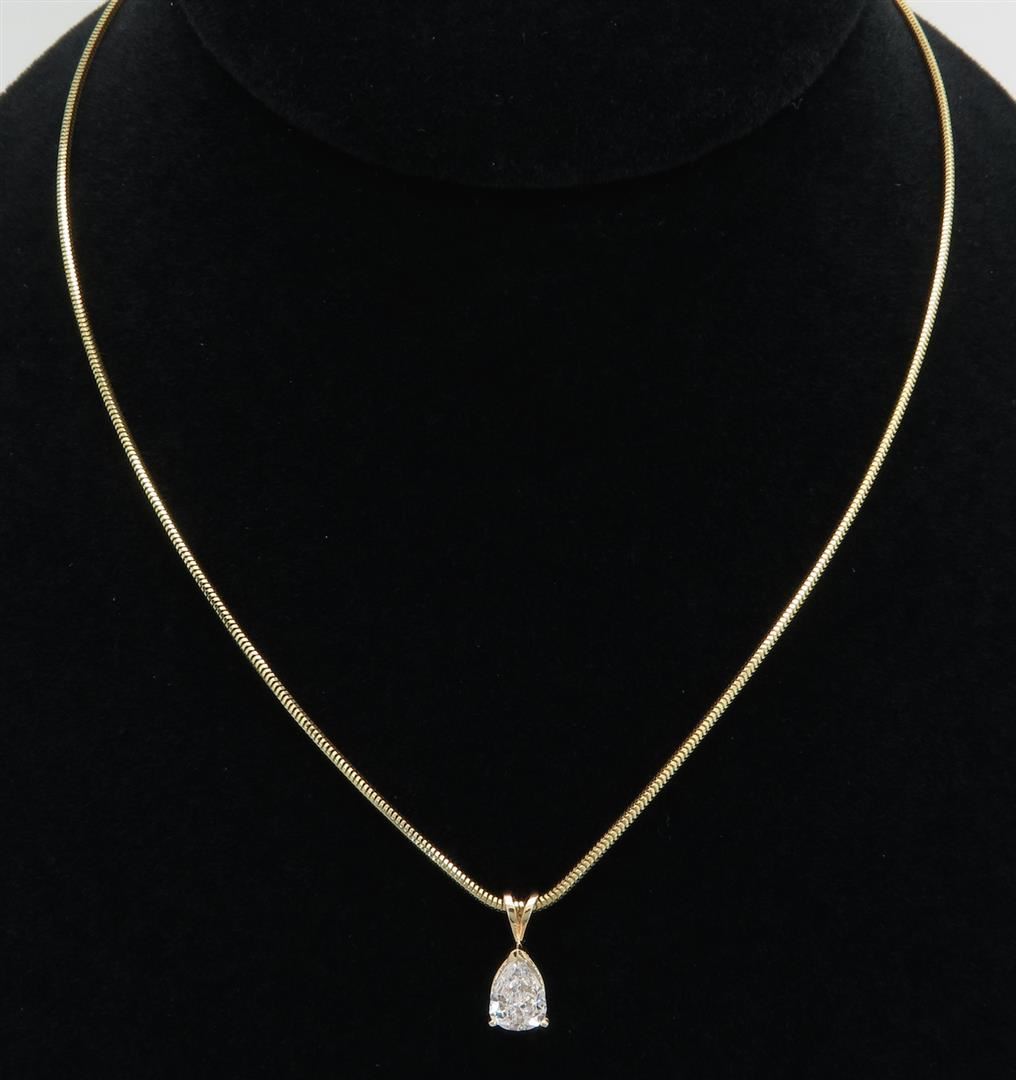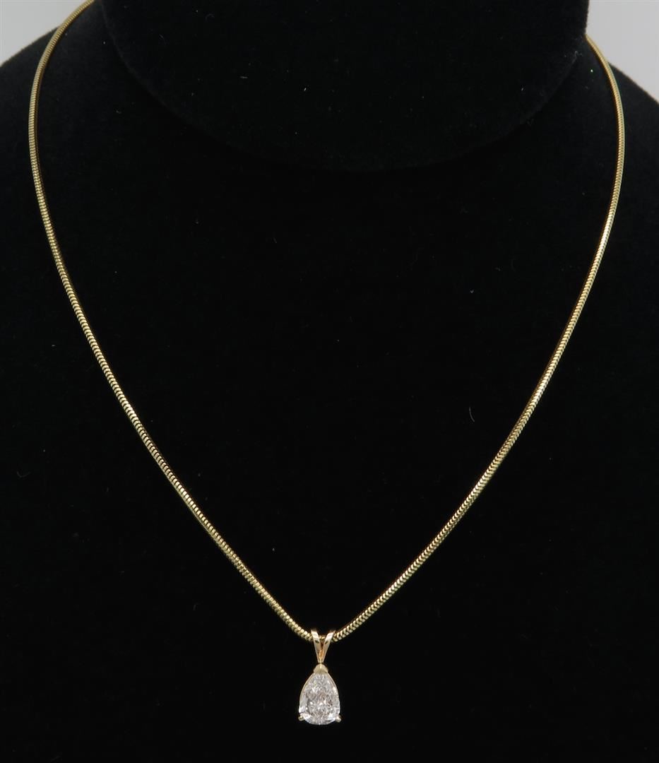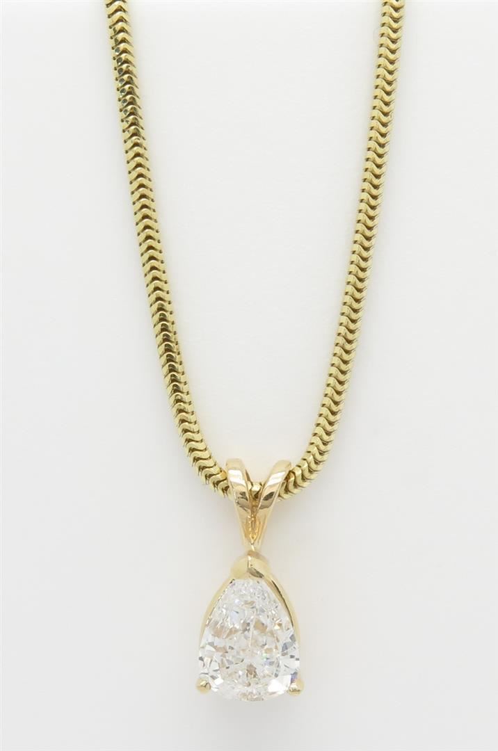 One tested 14K yellow gold diamond pendant with chain. Containing: One Pear Cut Diamond. Approximate size: .76CT. Clarity: SI1, Color: H. Diamonds are graded in the mounting, unless otherwise stated. Weight: 5.1 grams, Size of chain: 18".