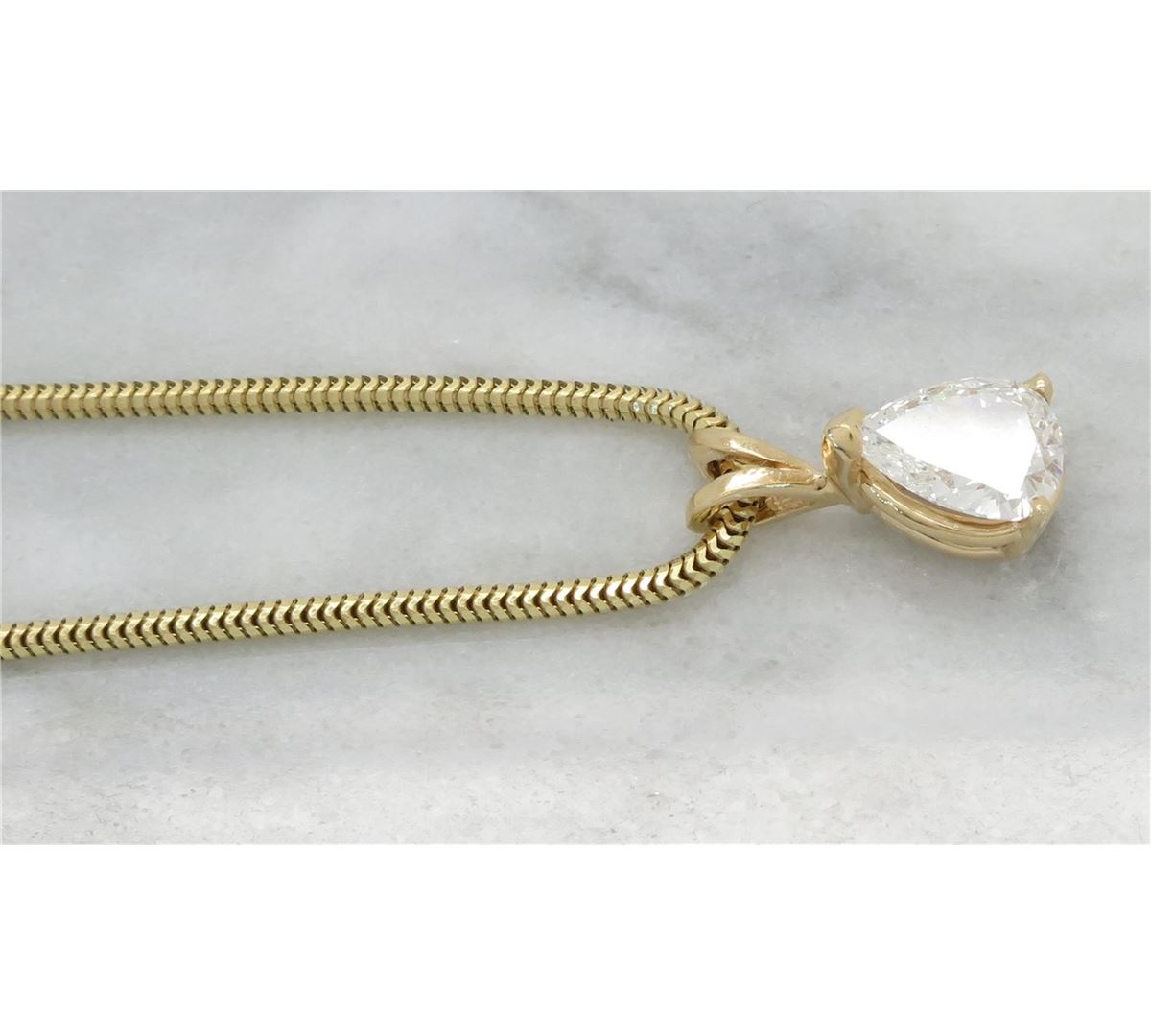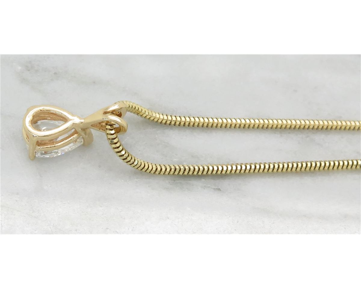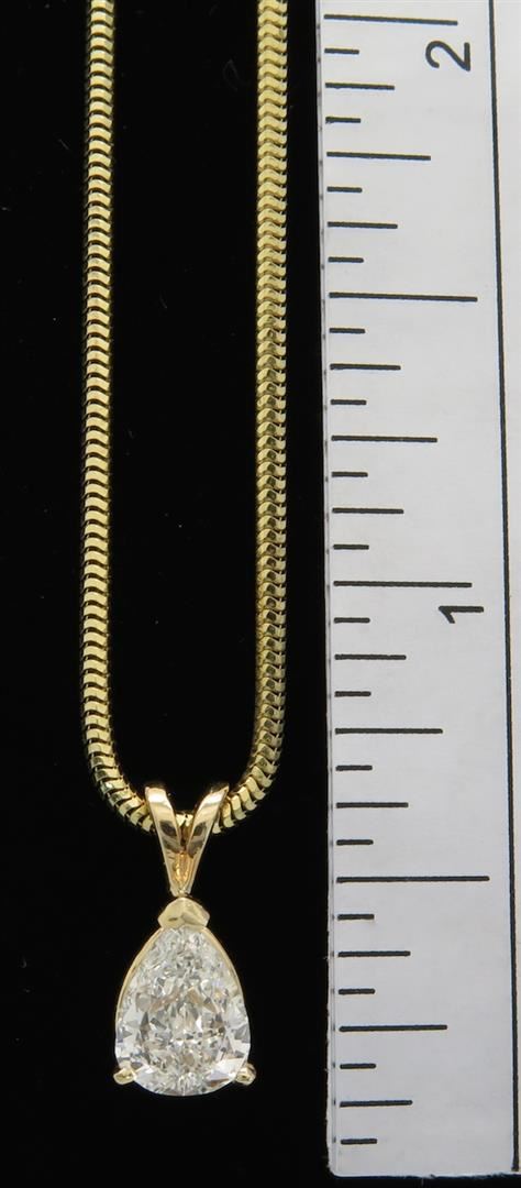 One tested 14K yellow gold diamond pendant with chain. Containing: One Pear Cut Diamond. Approximate size: .76CT. Clarity: SI1, Color: H. Diamonds are graded in the mounting, unless otherwise stated. Weight: 5.1 grams, Size of chain: 18".