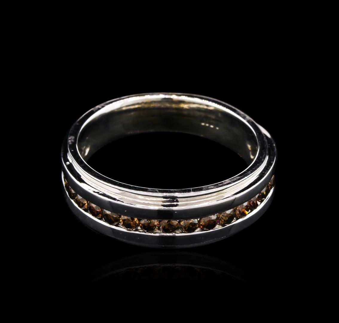 One electronically tested 14KT white gold gents cast diamond ring with a bright polish finish. The ring features a diamond set curvature, completed by a five millimeter wide band. Identified with markings of "14K". Condition is new, good workmanship. Containing: Sixteen channel set round brilliant cut diamonds, measuring 2.30 - 2.20 x 1.35mm (depth est.) approximate total weight of 16 Stones = 0.76ct. Color grade is an average for the group. Graded in the setting. Clarity: VS-2 to SI-1. Total Weight of Diamonds 0.76ct. Total Weight of Ring 9.33gm. AIG Appraised at $3,730.00.